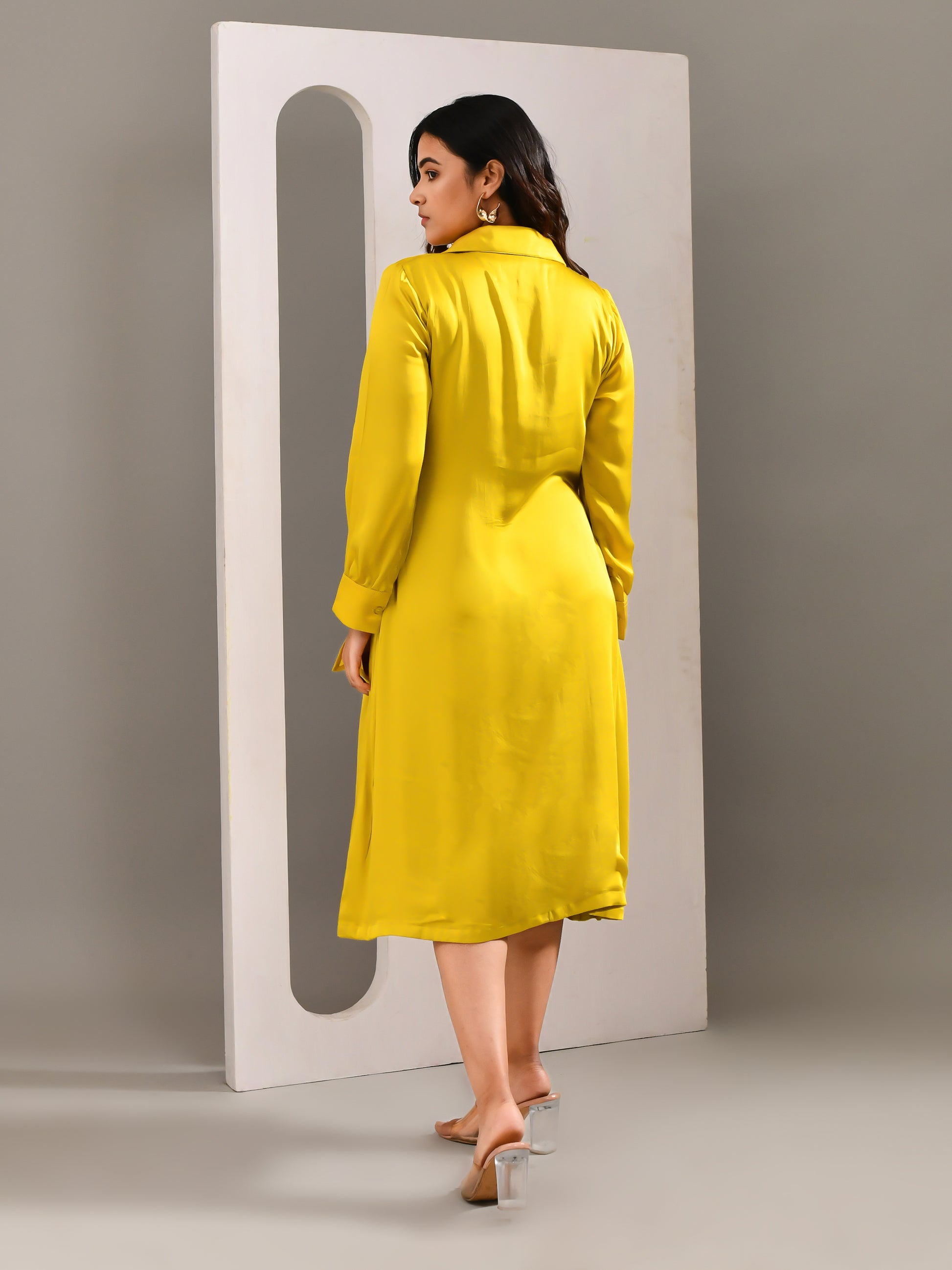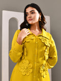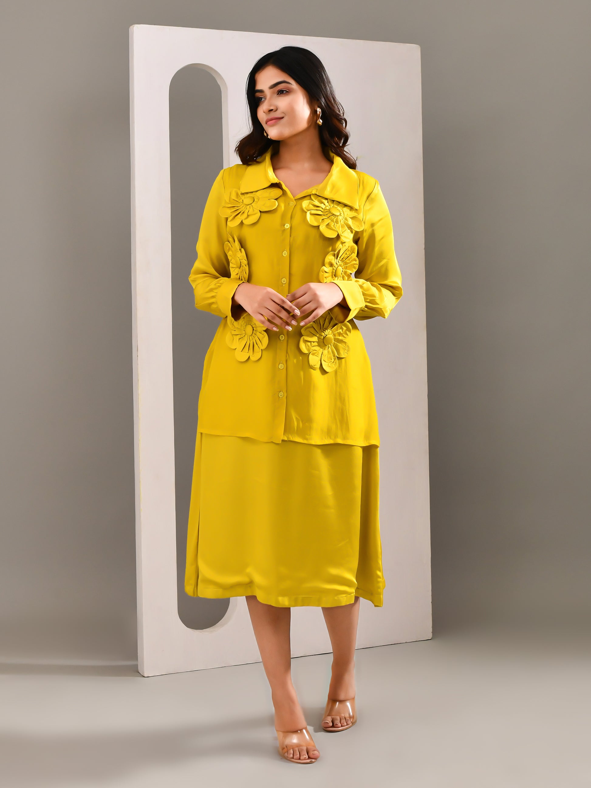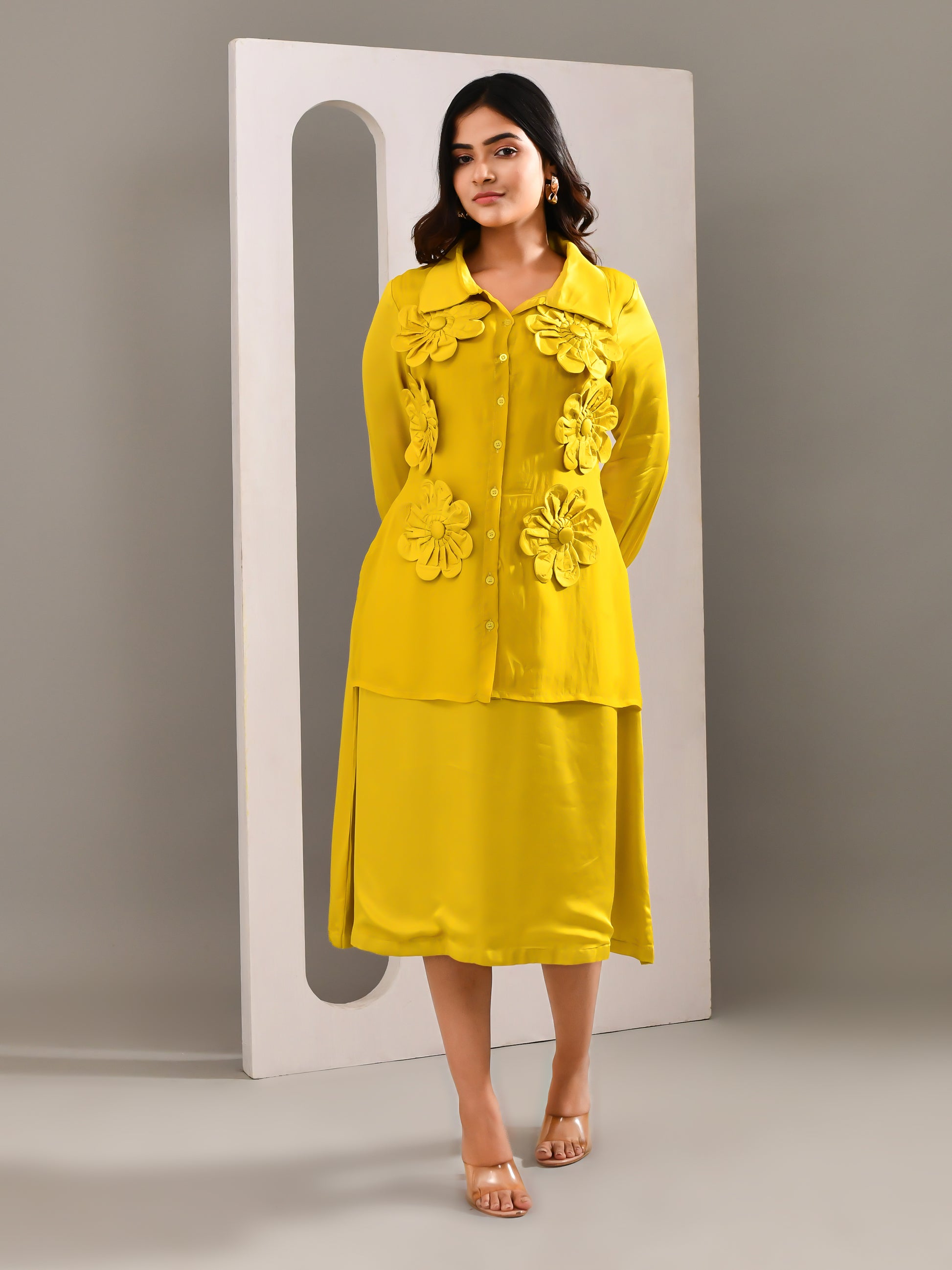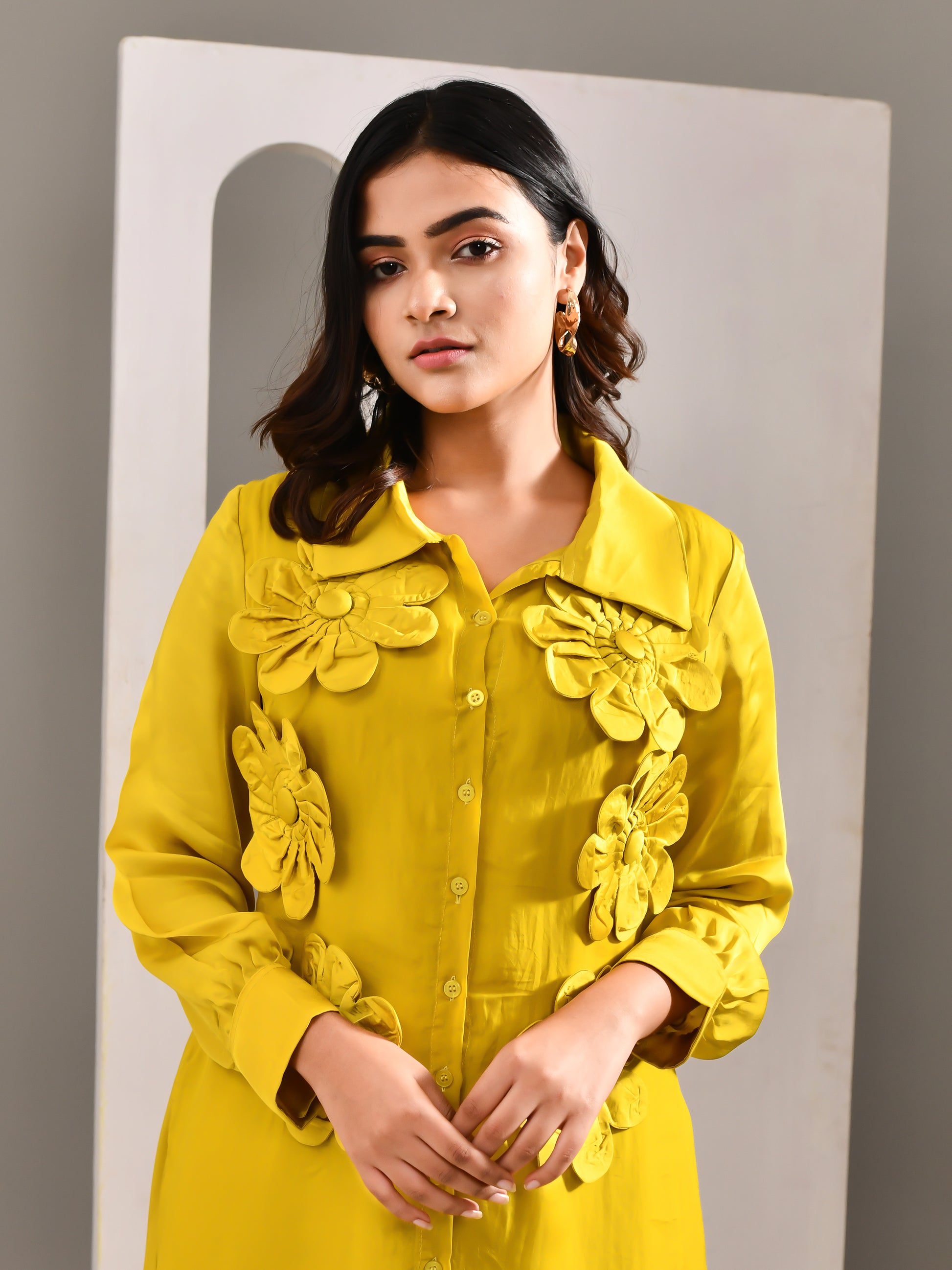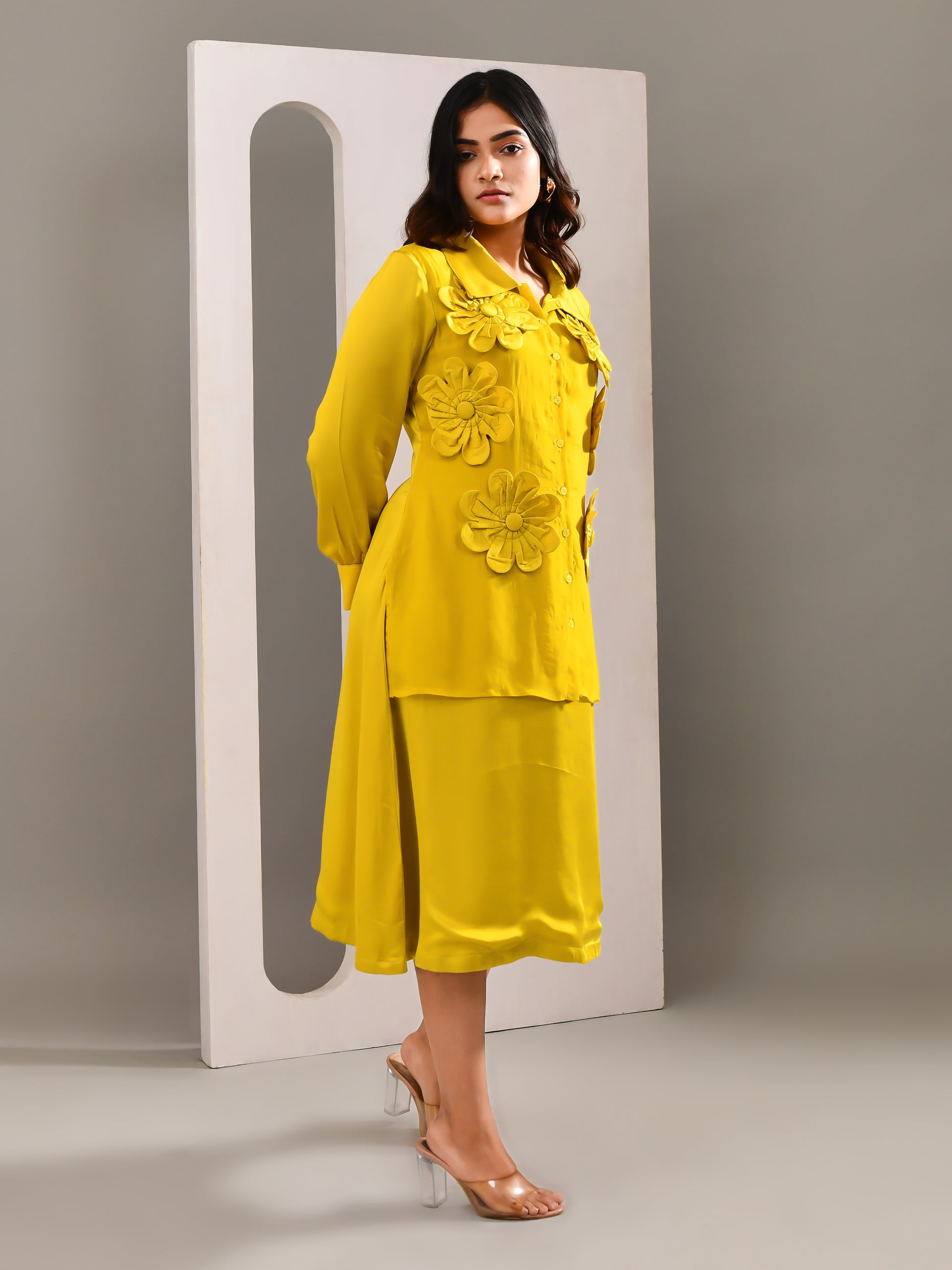 A shirt dress designed to give the illusion of a two piece, bringing a fresh twist to everyday dressing. The vibrant tone paired with a fluid, airy fabric keeps the look light and expressive. Finished with creative floral patchwork detailing, it stands out with ease while staying effortlessly wearable.