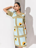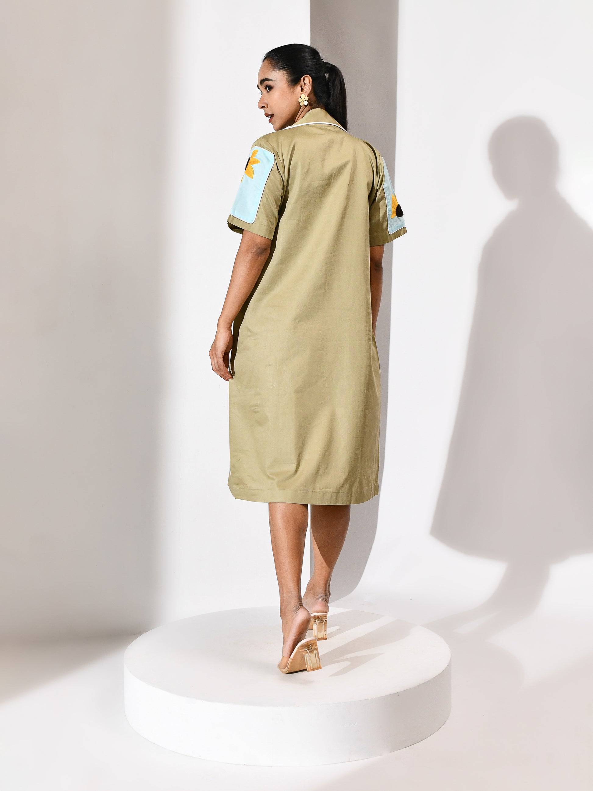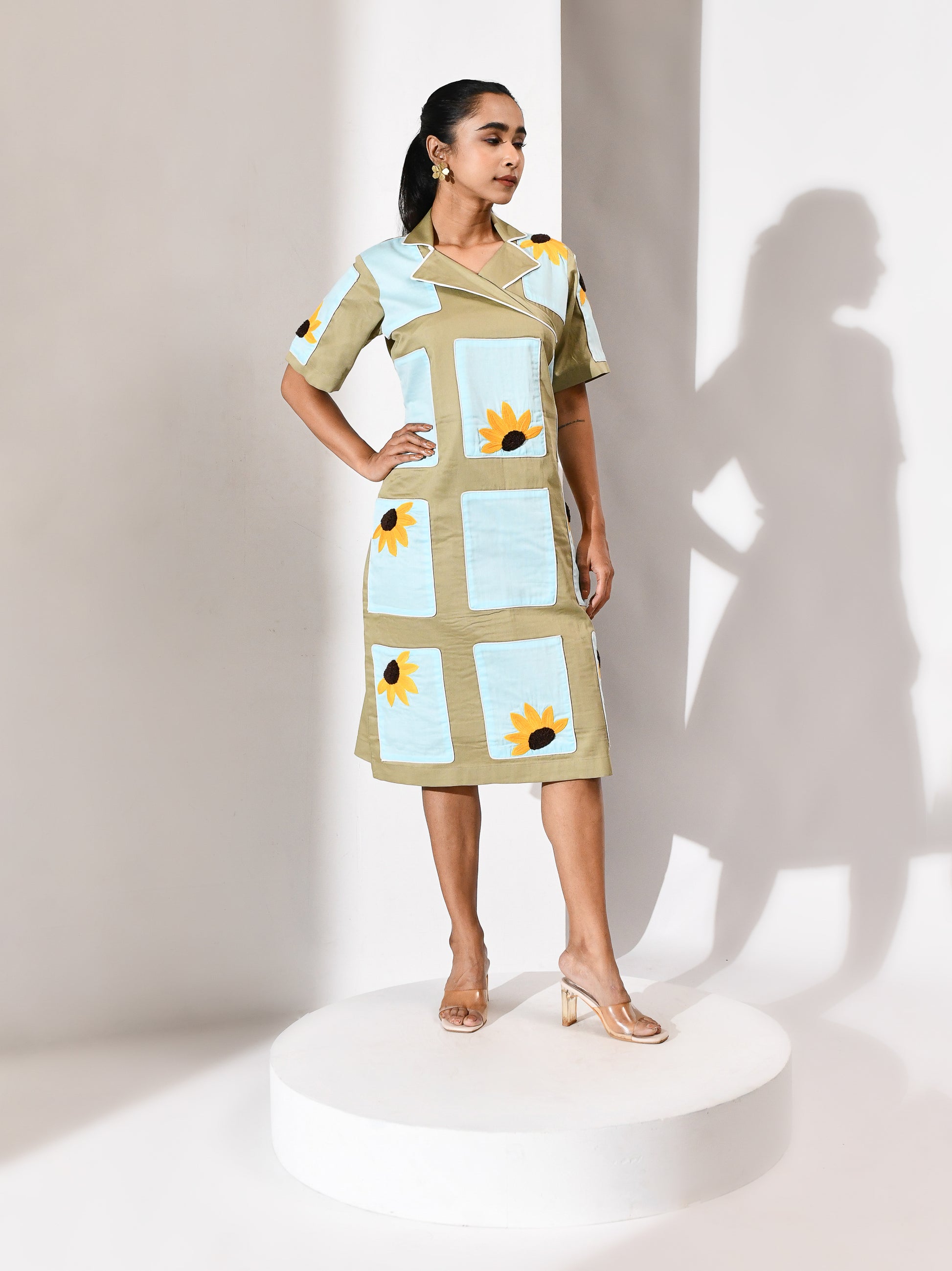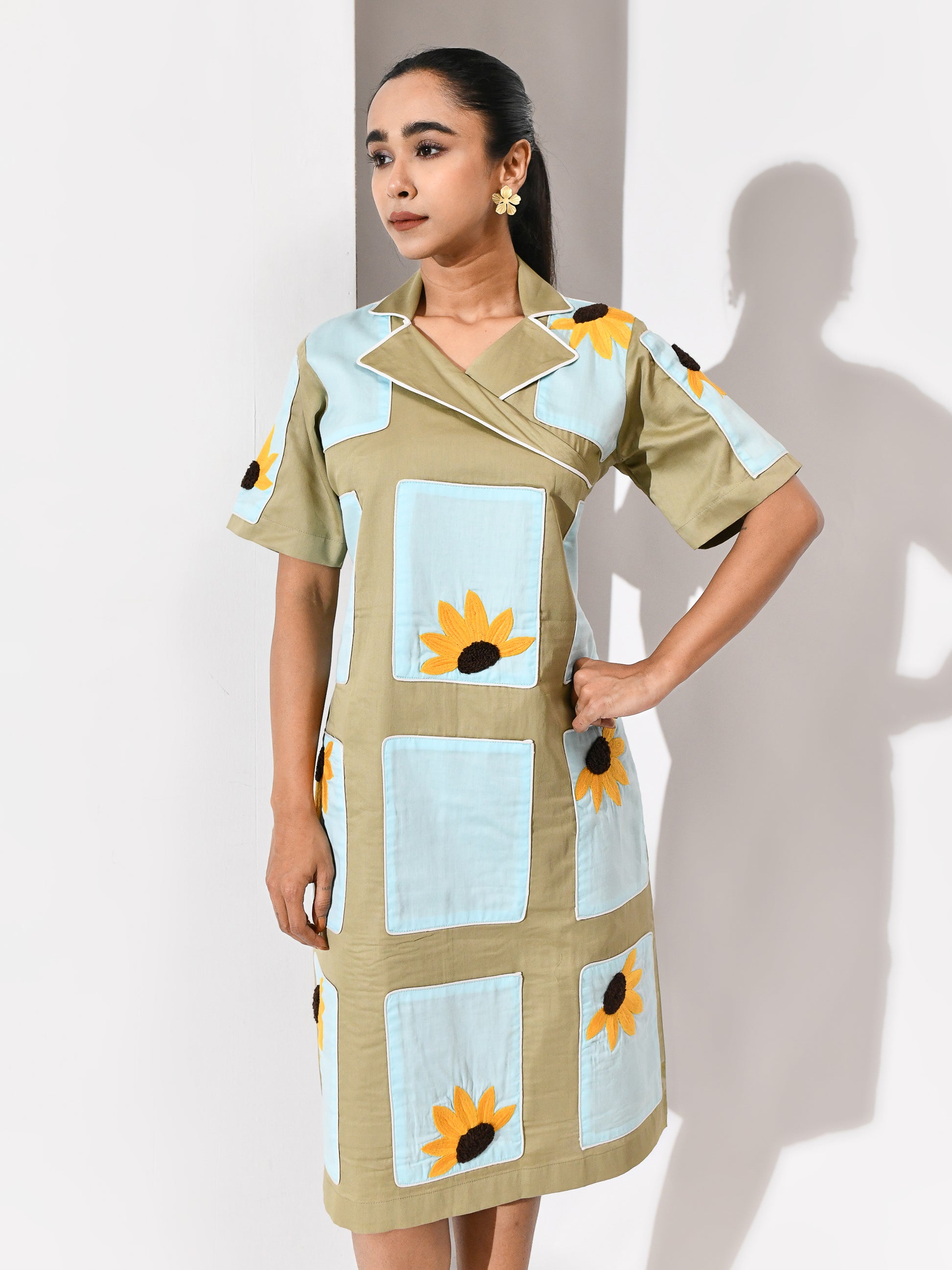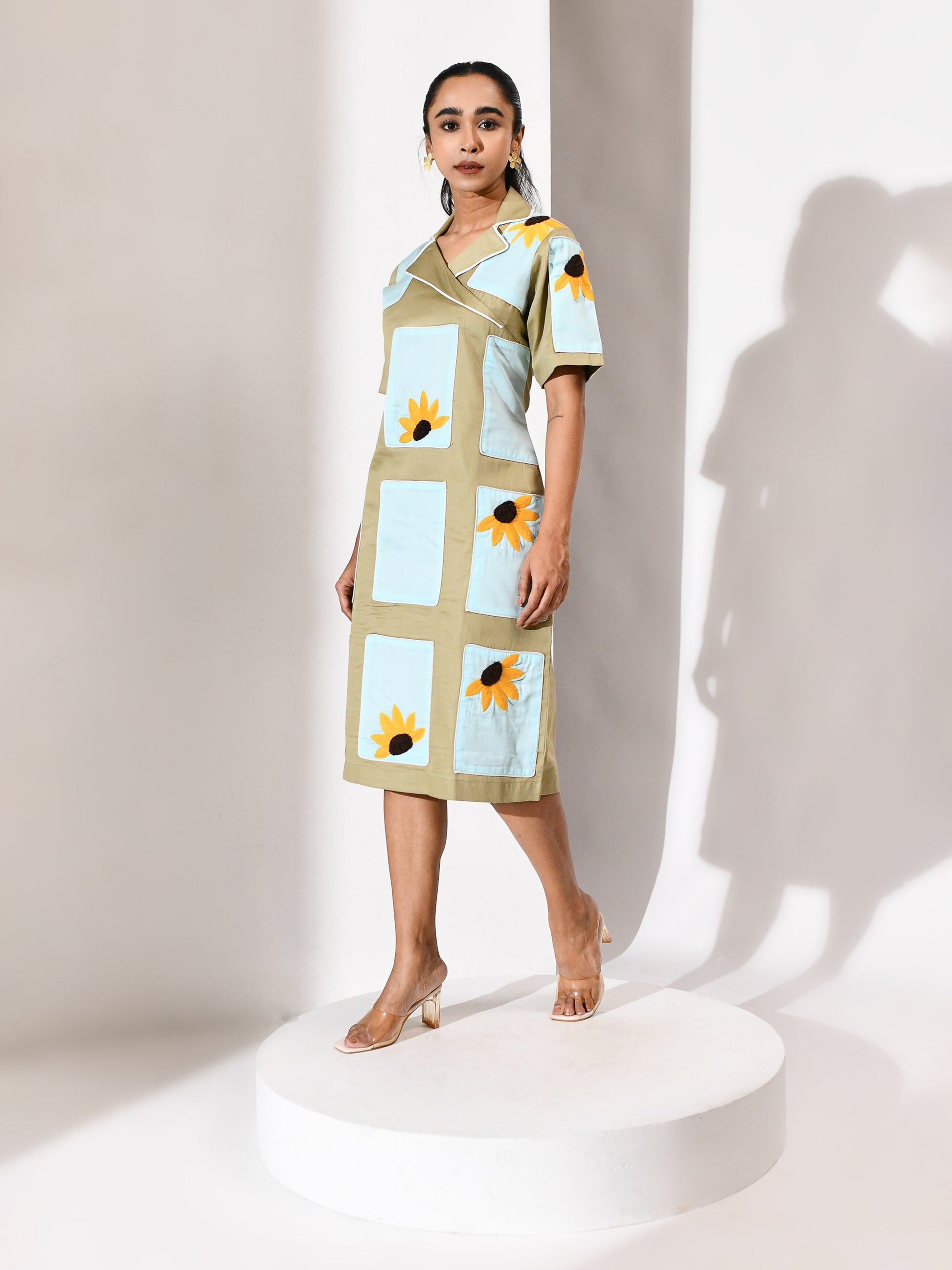 Softly balanced in calming tones, this dress brings together beige and ice blue in a light, refreshing palette. Delicate sunflower embroidery adds warmth and detail, creating a gentle highlight across the look. Easy yet expressive, it carries a sense of quiet charm with a refined finish.