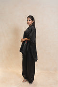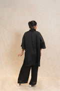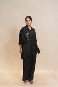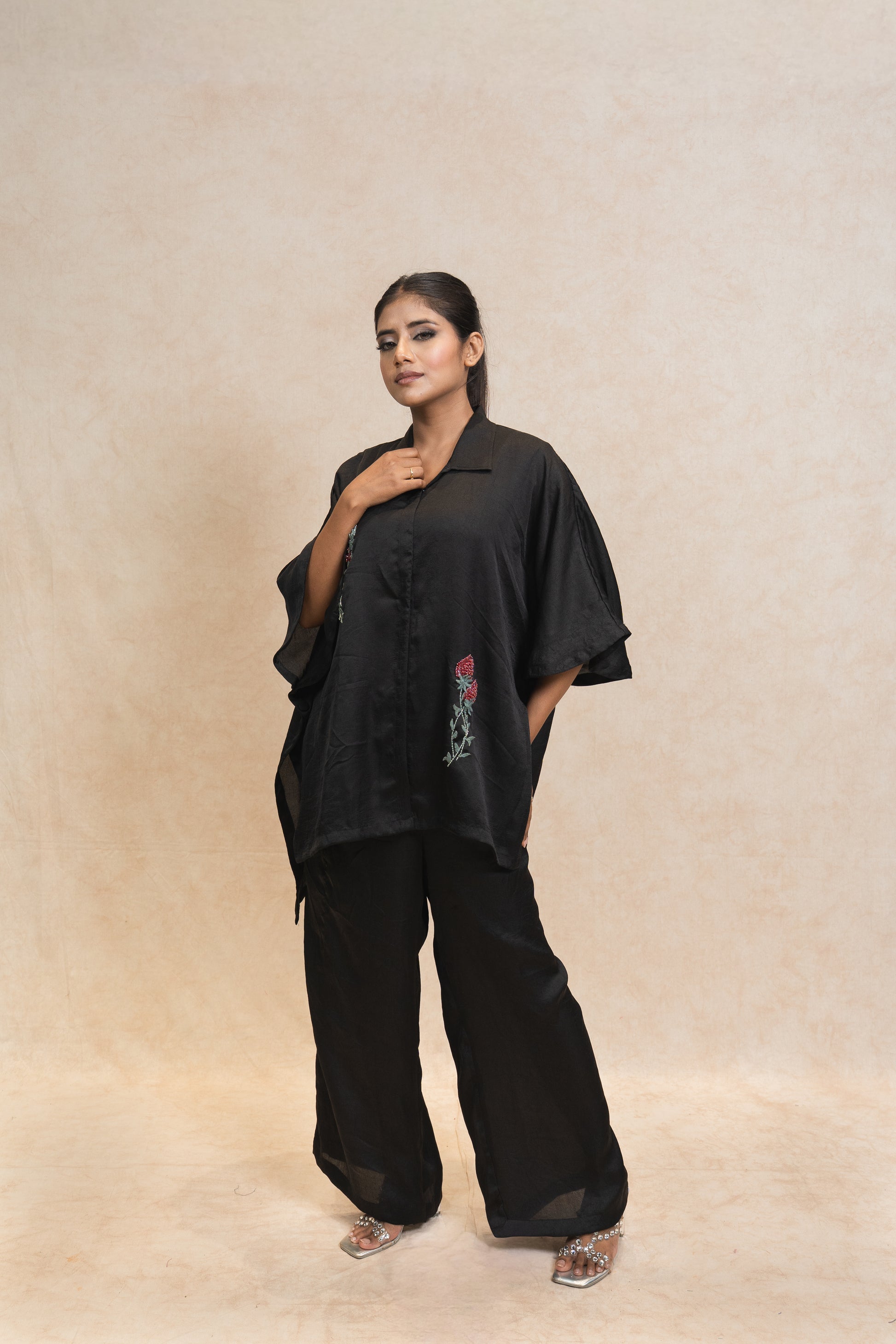 A contemporary black co-ord set that embodies effortless sophistication with a relaxed silhouette. Featuring an oversized embroidered shirt paired with wide-leg bottoms, this outfit blends comfort and style, making it versatile for casual gatherings, travel or chic evening looks.