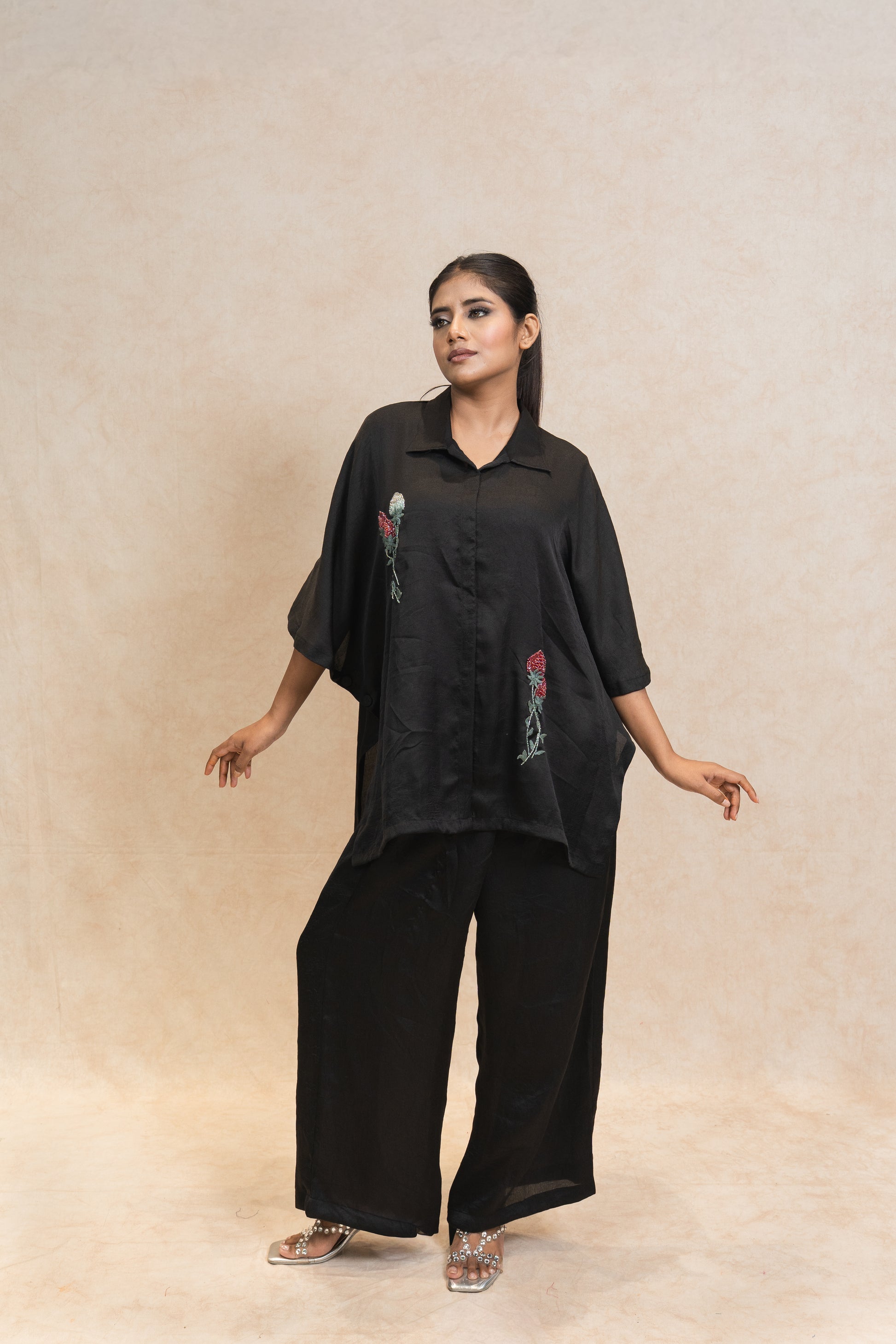 Black Oversized Embroidered Shirt with Wide-Leg Bottom