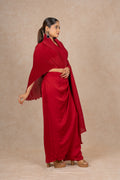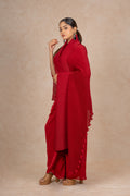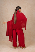 This striking ensemble is a masterclass in monochromatic elegance, rendered entirely in a luxurious, deep crimson red. The outfit consists of three key pieces, all showcasing meticulous textile work.