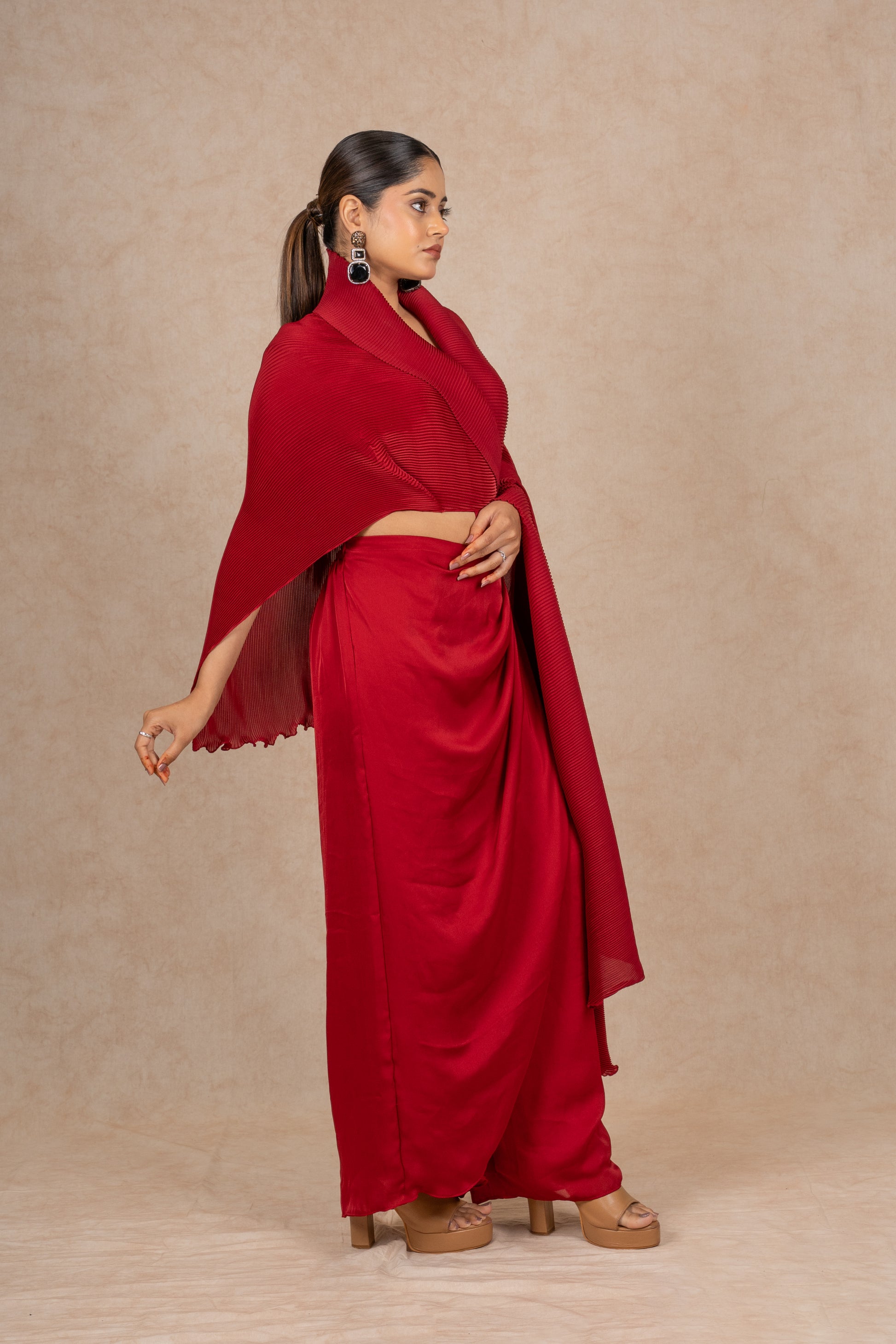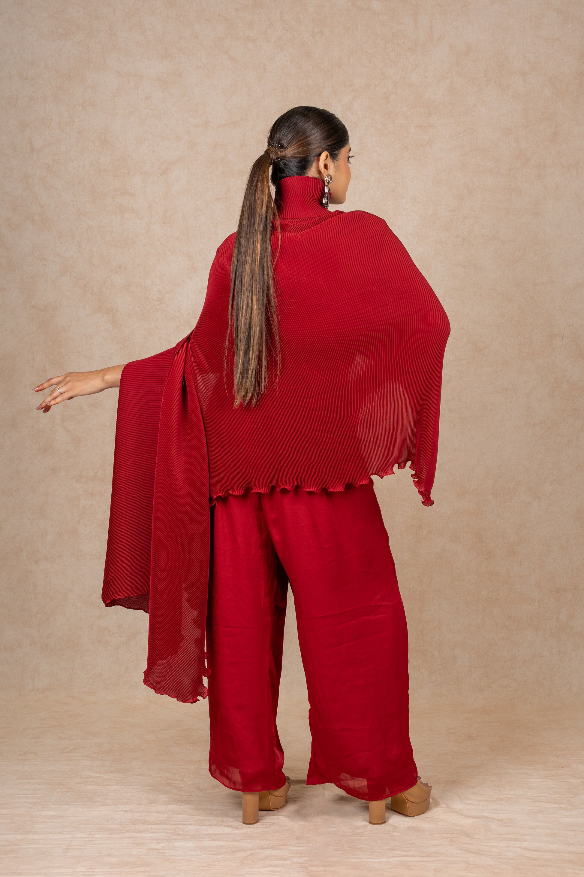 The top is a sophisticated crimson pleated crop top. It features a high, structured collar that creates a sharp, tailored neckline, contrasting beautifully with the soft pleats that form the body of the top. These pleats are finely crinkled, adding subtle texture and depth.