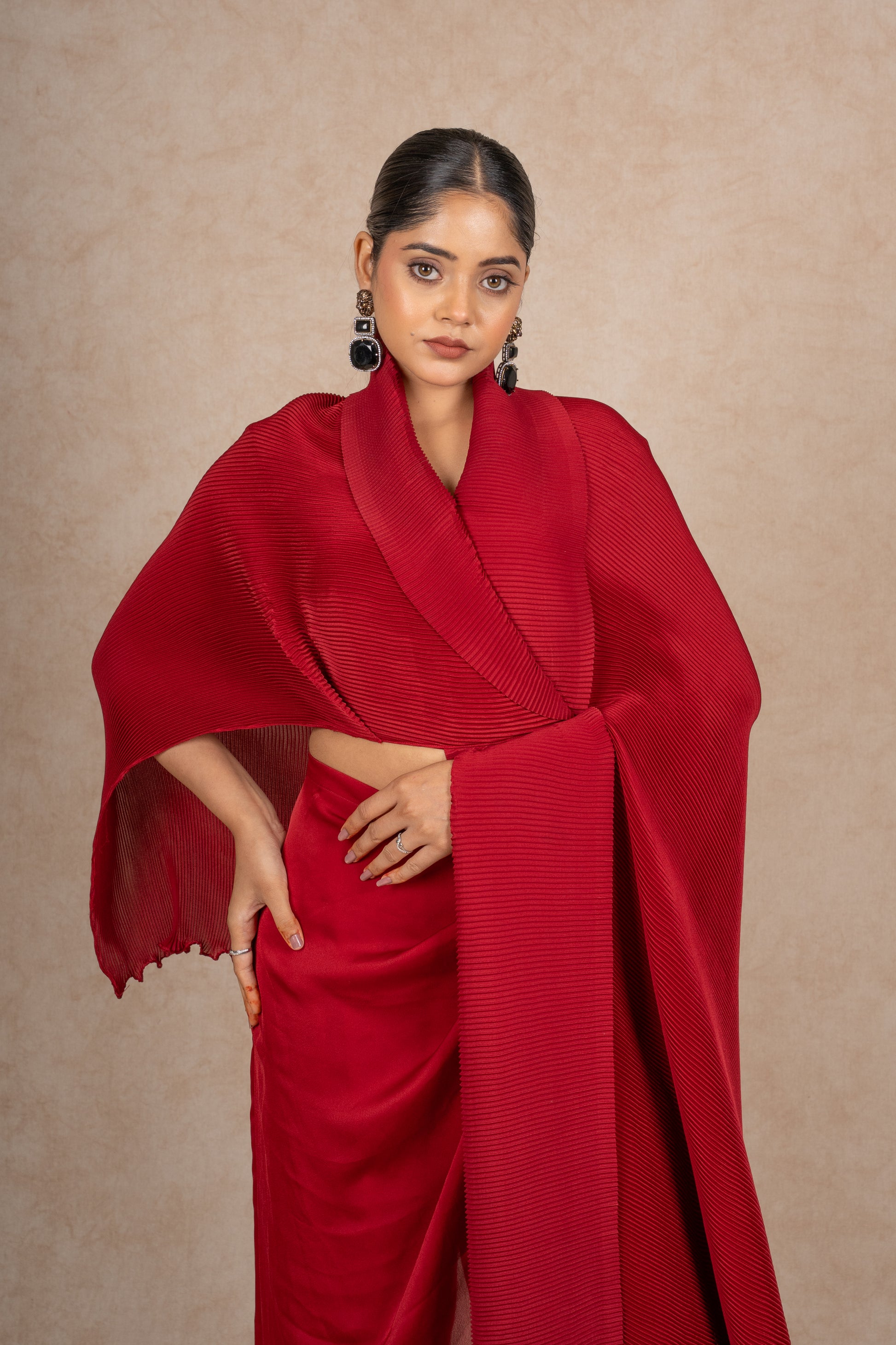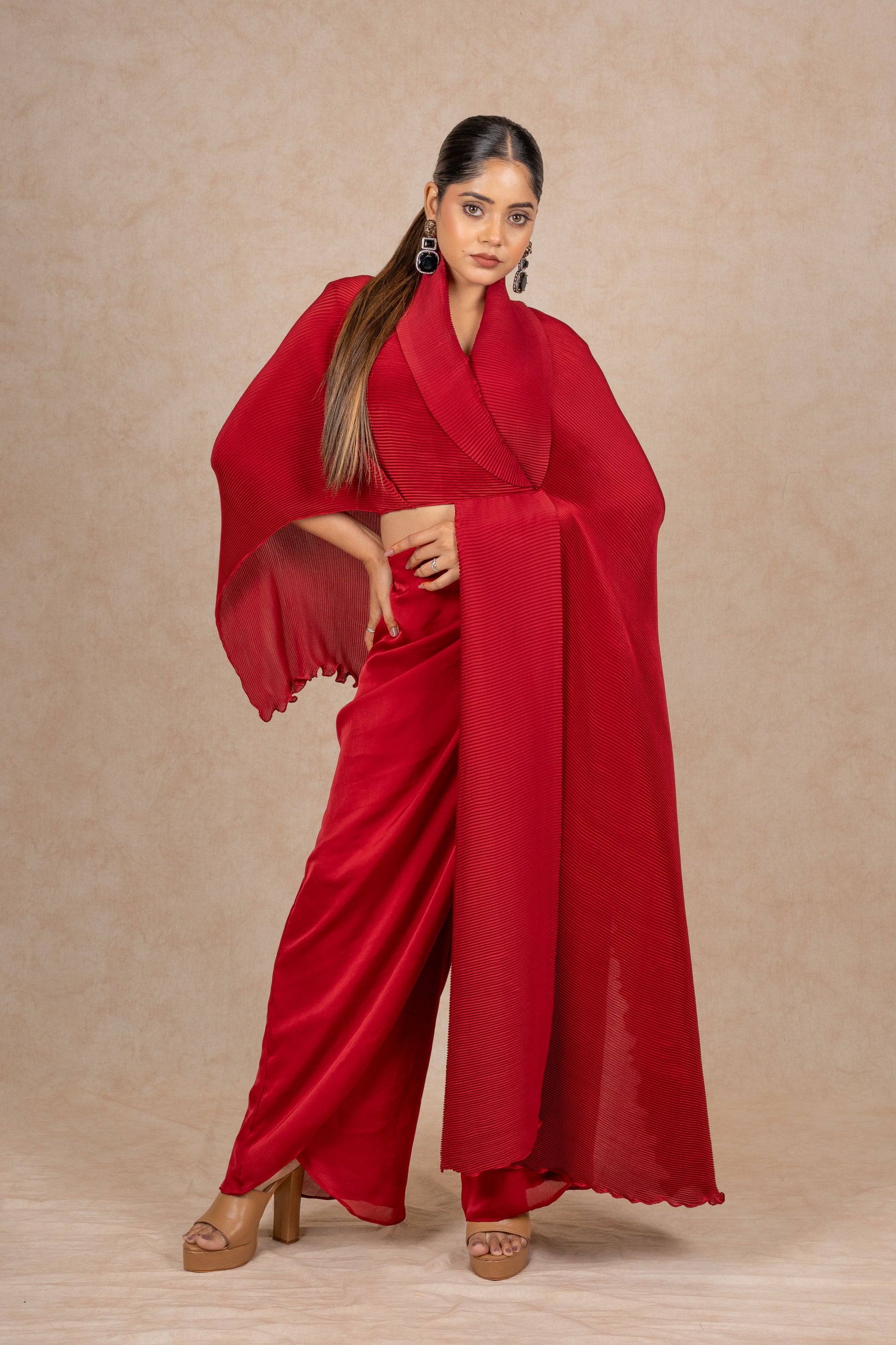 Completing the look is a dramatic pleated red cape or shawl. This piece is the textural highlight of the outfit, featuring extensive, fine pleating that creates a dynamic, architectural effect. The cape is designed to fall elegantly over the shoulders and arms, adding volume and movement to the overall silhouette.