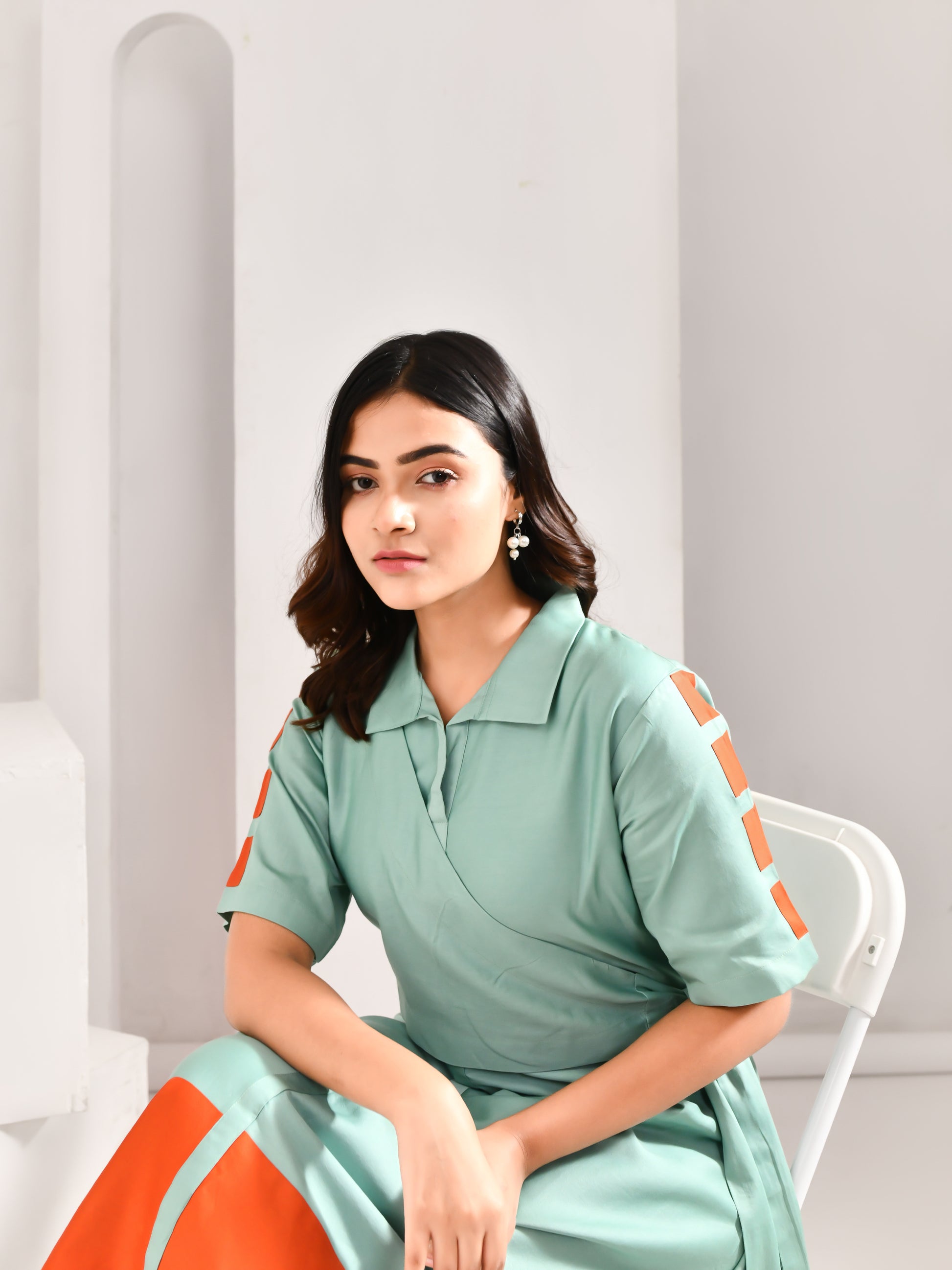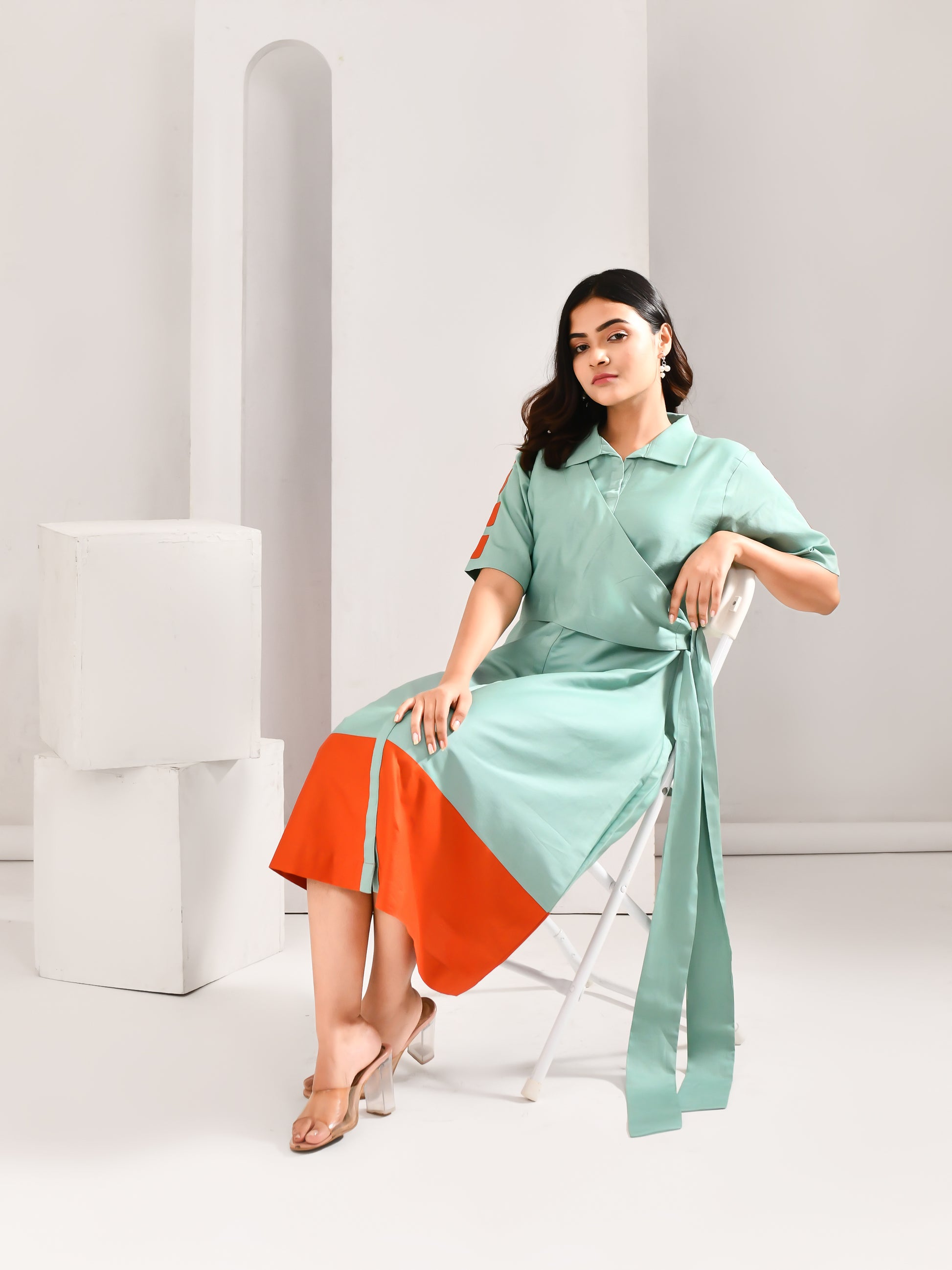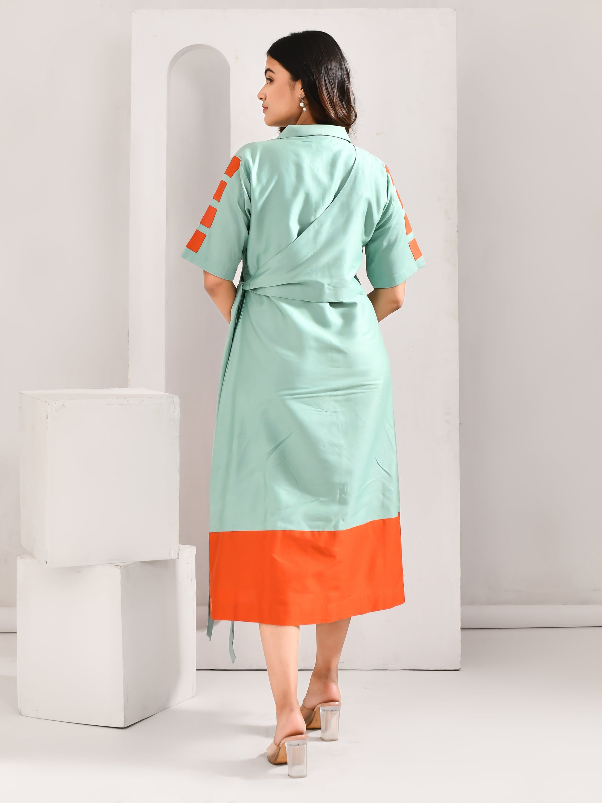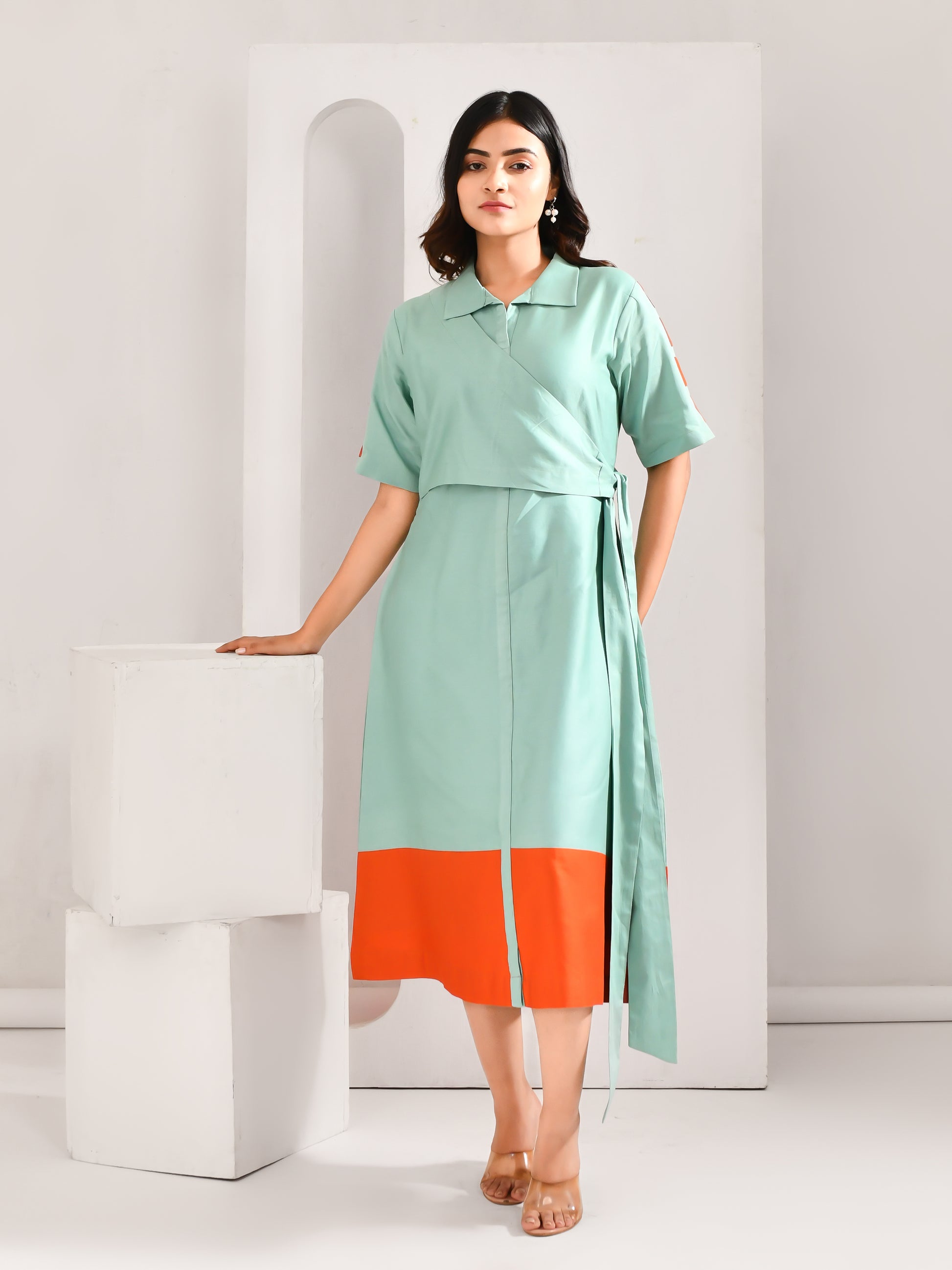 A refreshing take on everyday dressing, this midi brings together soft tones with a bold contrast finish. The wrap detail adds structure, while the pop of colour at the hem gives it a striking edge. Clean, modern and quietly statement making, it moves effortlessly through your day.