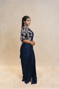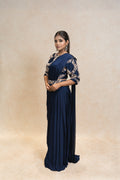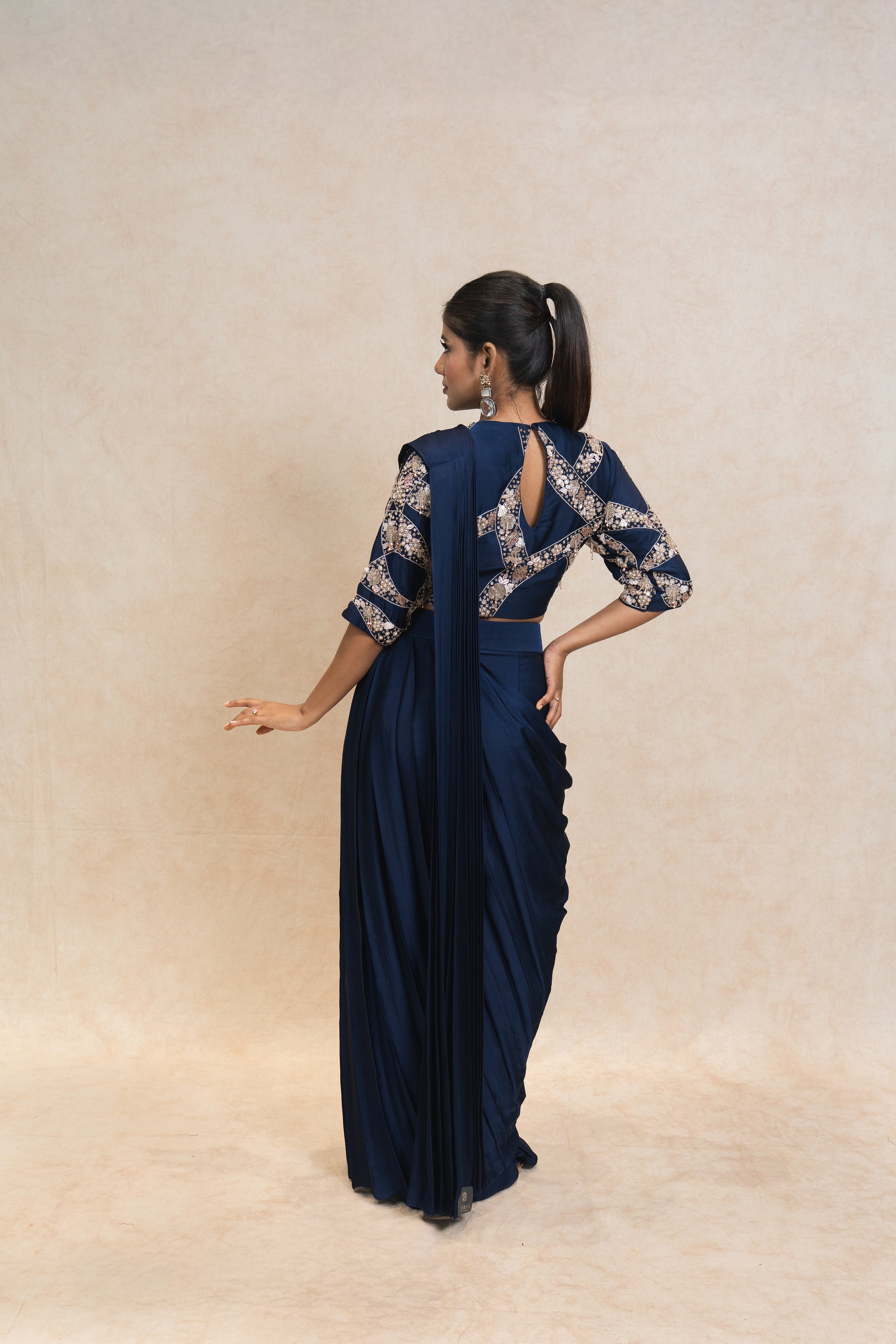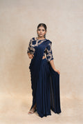 This stunning navy blue pre-stitched saree set blends elegance with modern detailing, making it perfect for weddings, receptions, festive occasions or cocktail events. The rich navy drape paired with an intricately embroidered blouse and embellished belt adds a regal touch, while the structured design ensures comfort and sophistication.