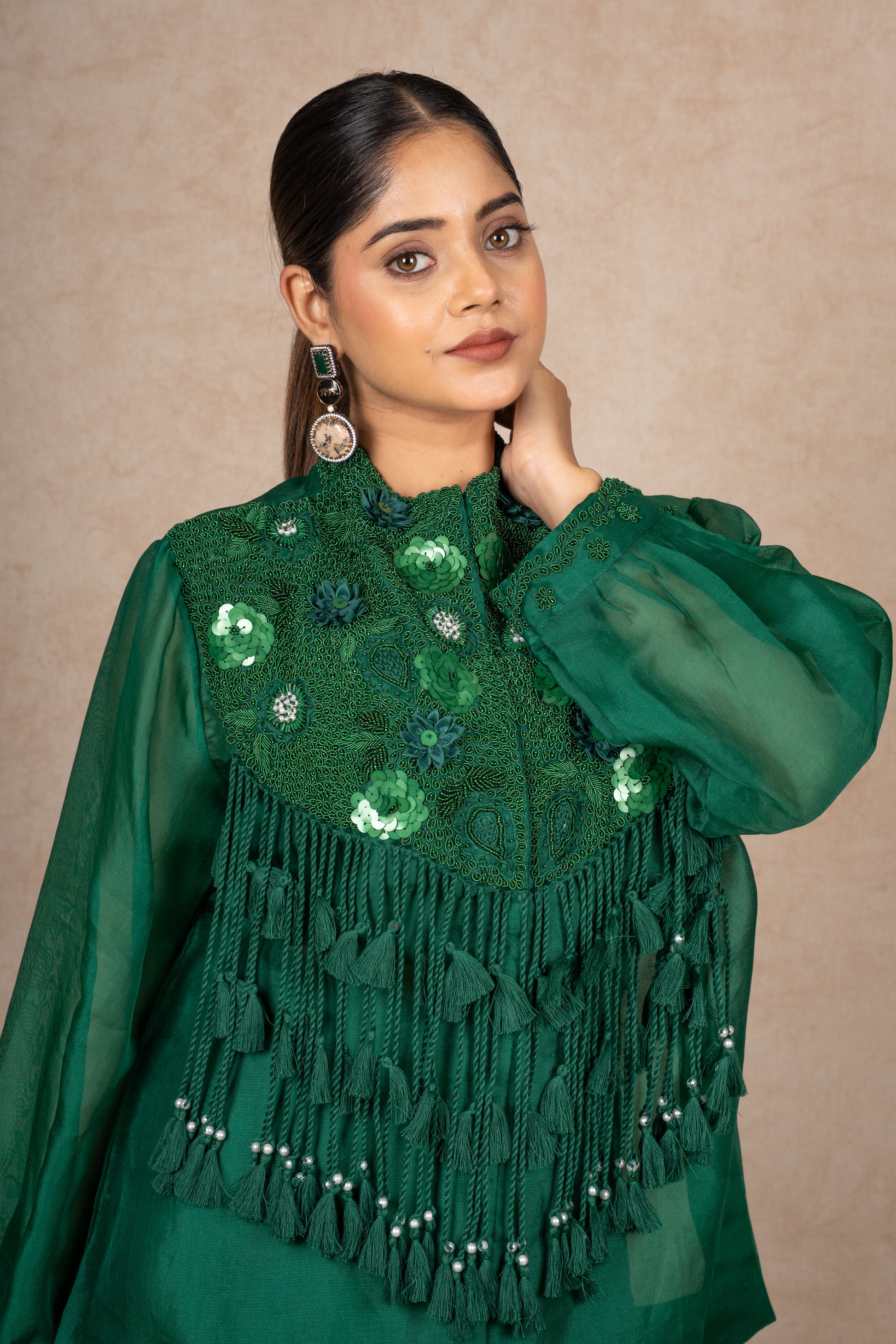 The top is crafted from a sheer fabric, organza, with a high neckline and full, voluminous sleeves that gather at the cuffs. The standout feature is the intricately embellished bodice, adorned with a mix of sequins, beads, and possibly small mirrors, creating a shimmering effect. Below the embellished yoke, a layer of tassels hangs gracefully, adding movement and texture to the piece.