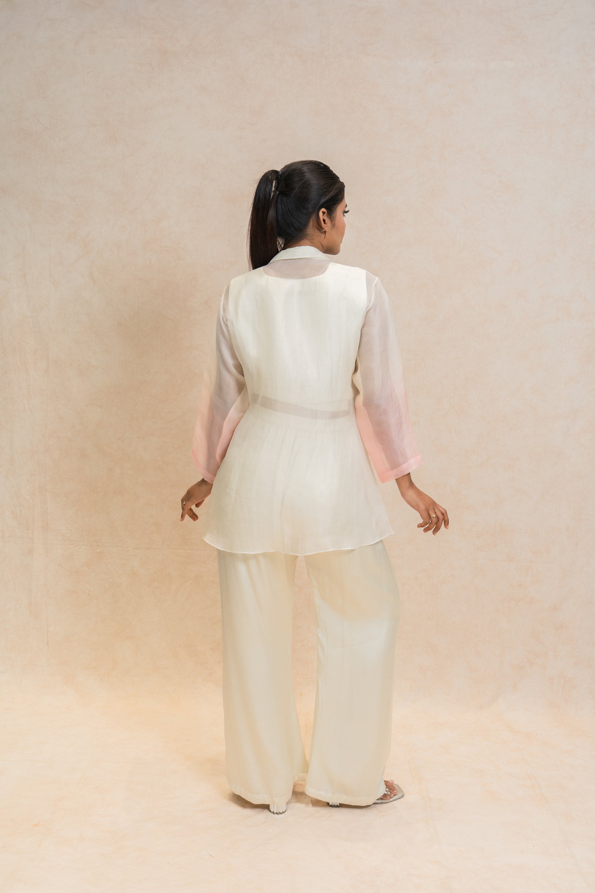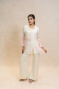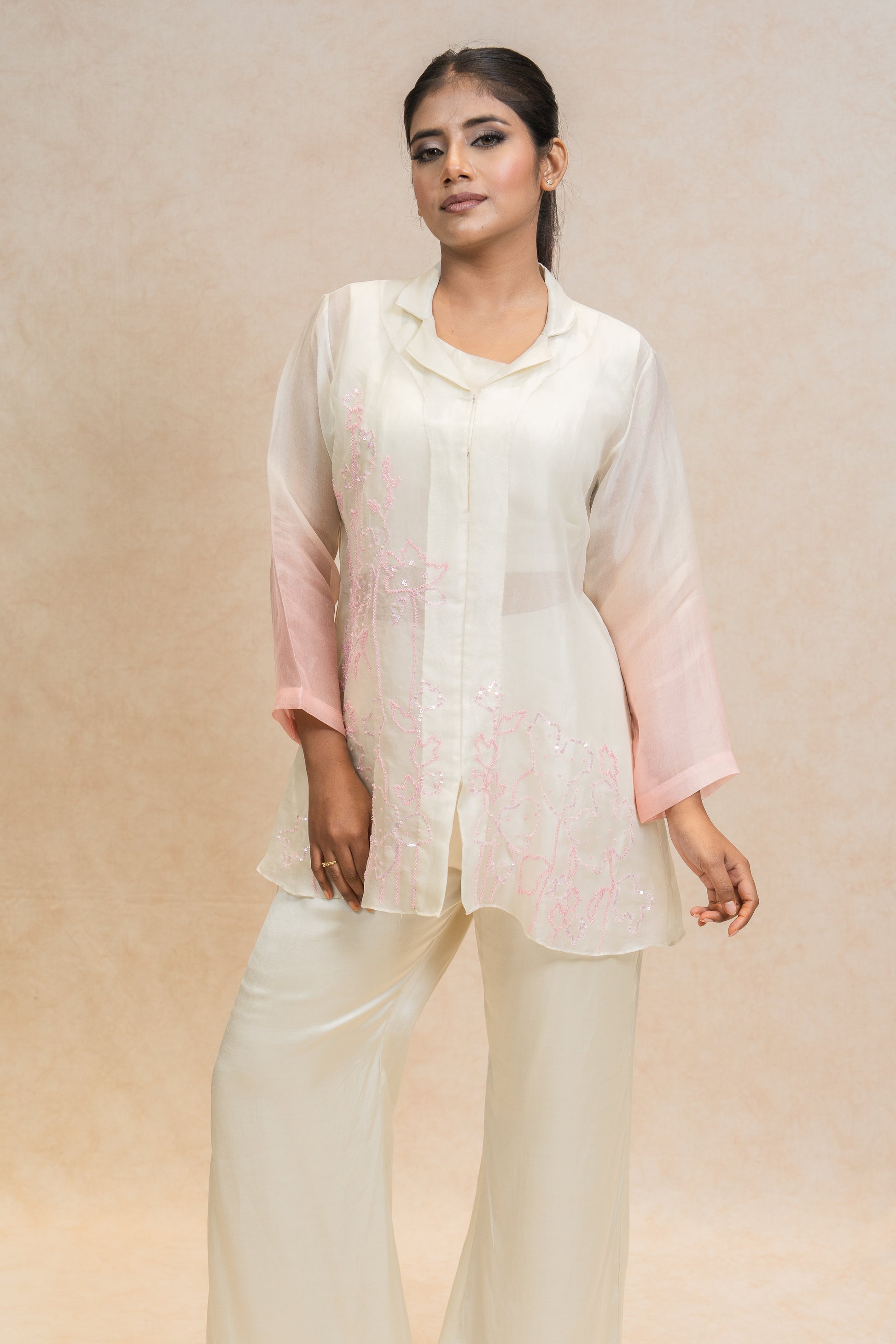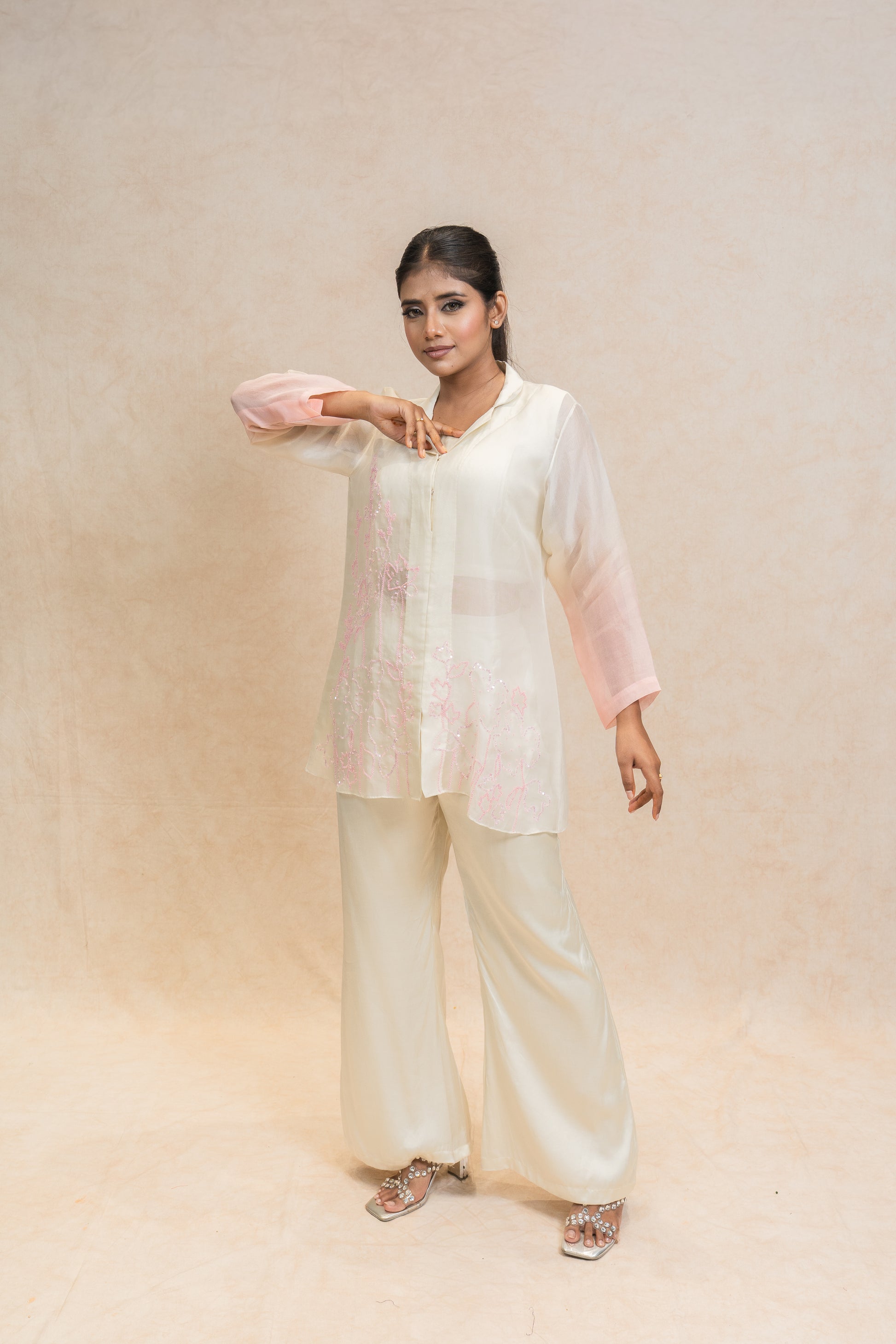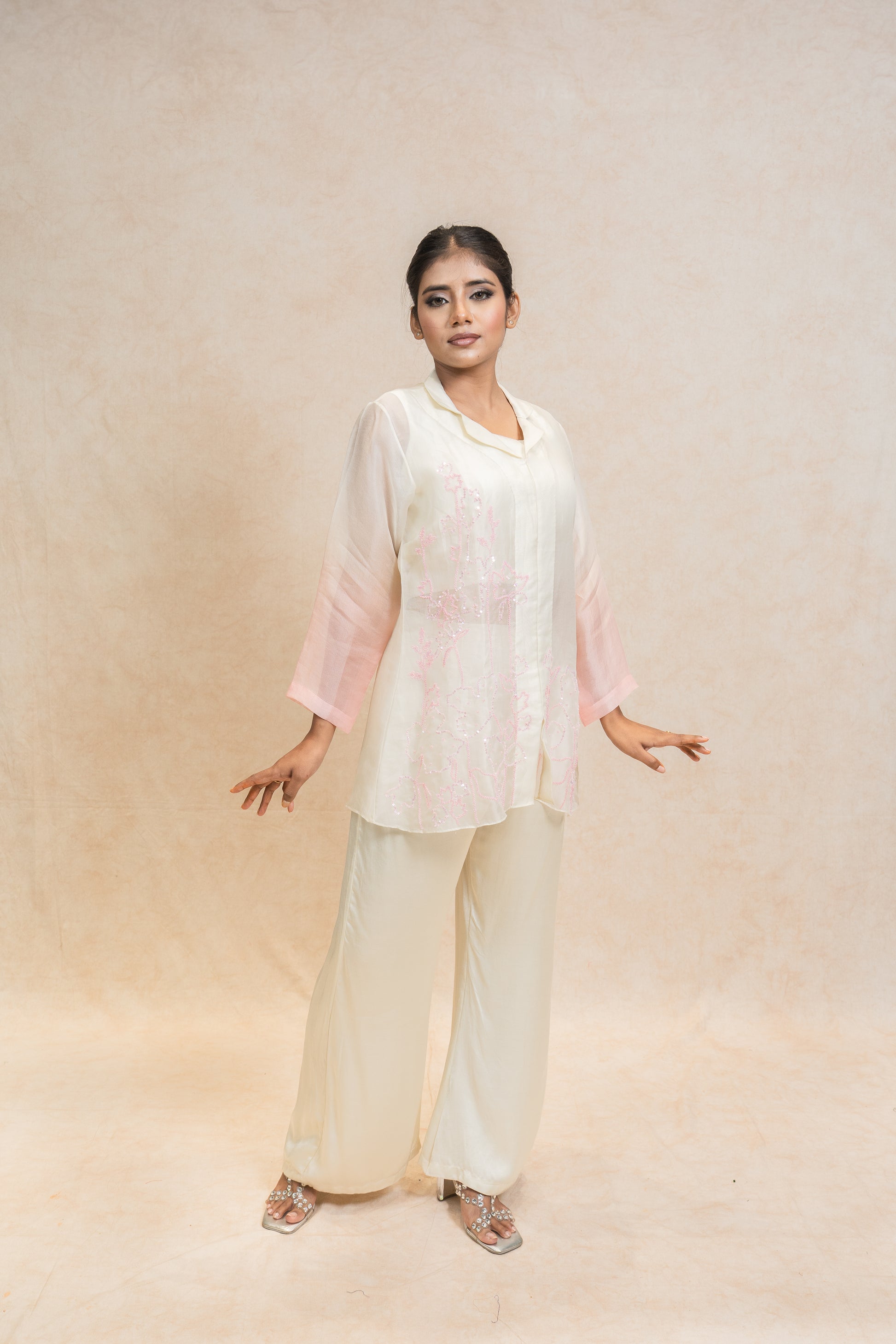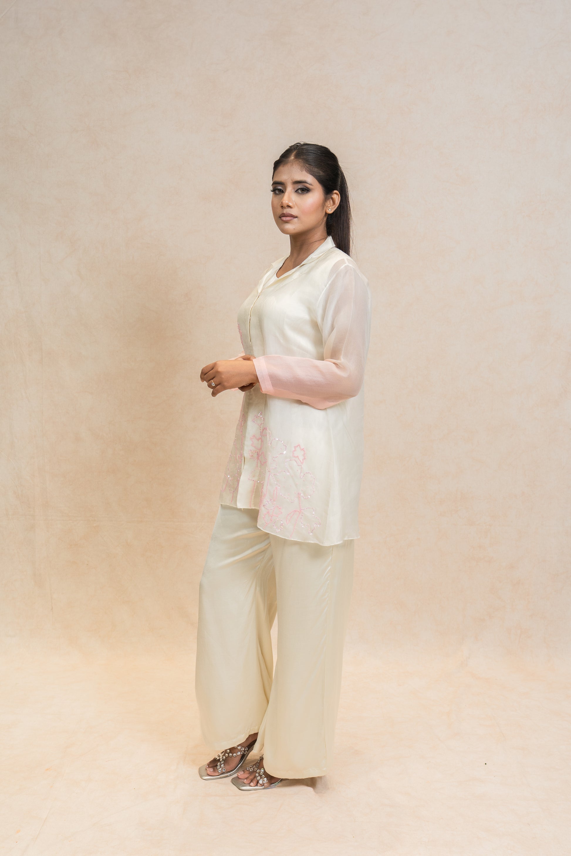 A graceful blend of elegance and comfort, this ivory co-ord set is designed for effortless sophistication. The soft ivory base paired with delicate blush pink accents makes it a versatile piece for day-to-evening wear. Subtle floral embroidery on the top adds a feminine charm, while the fluid silhouette ensures comfort with style. This look works beautifully as festive daywear, resort wear, or chic evening gatherings.