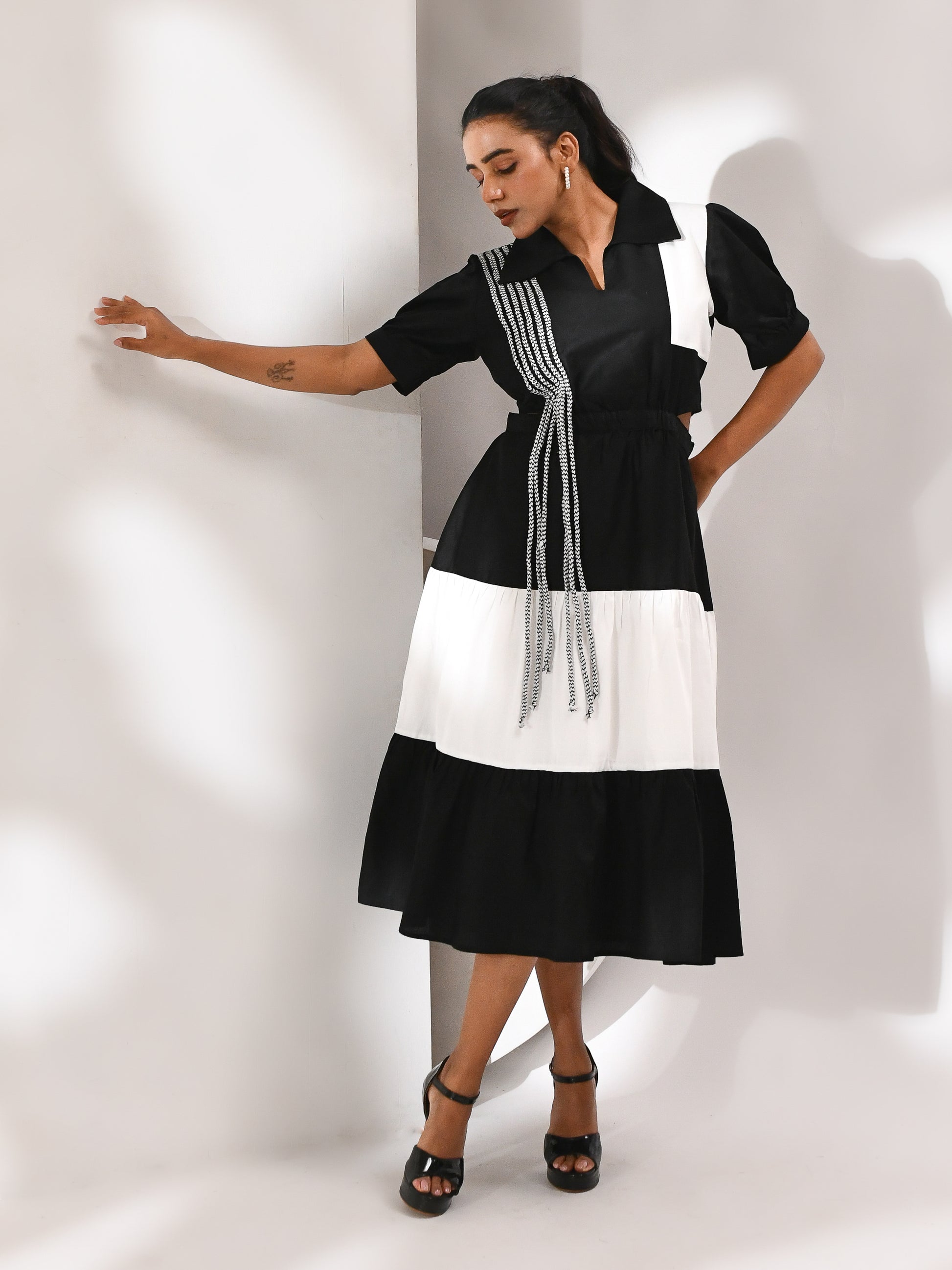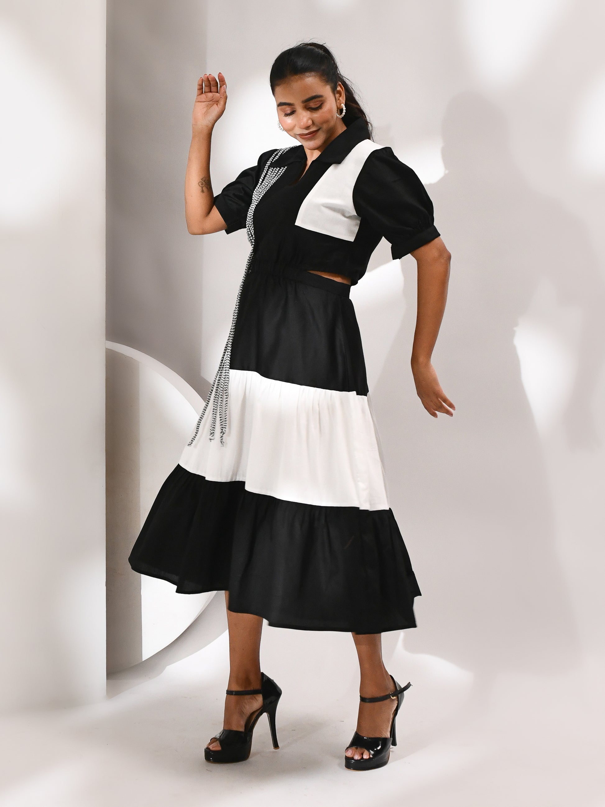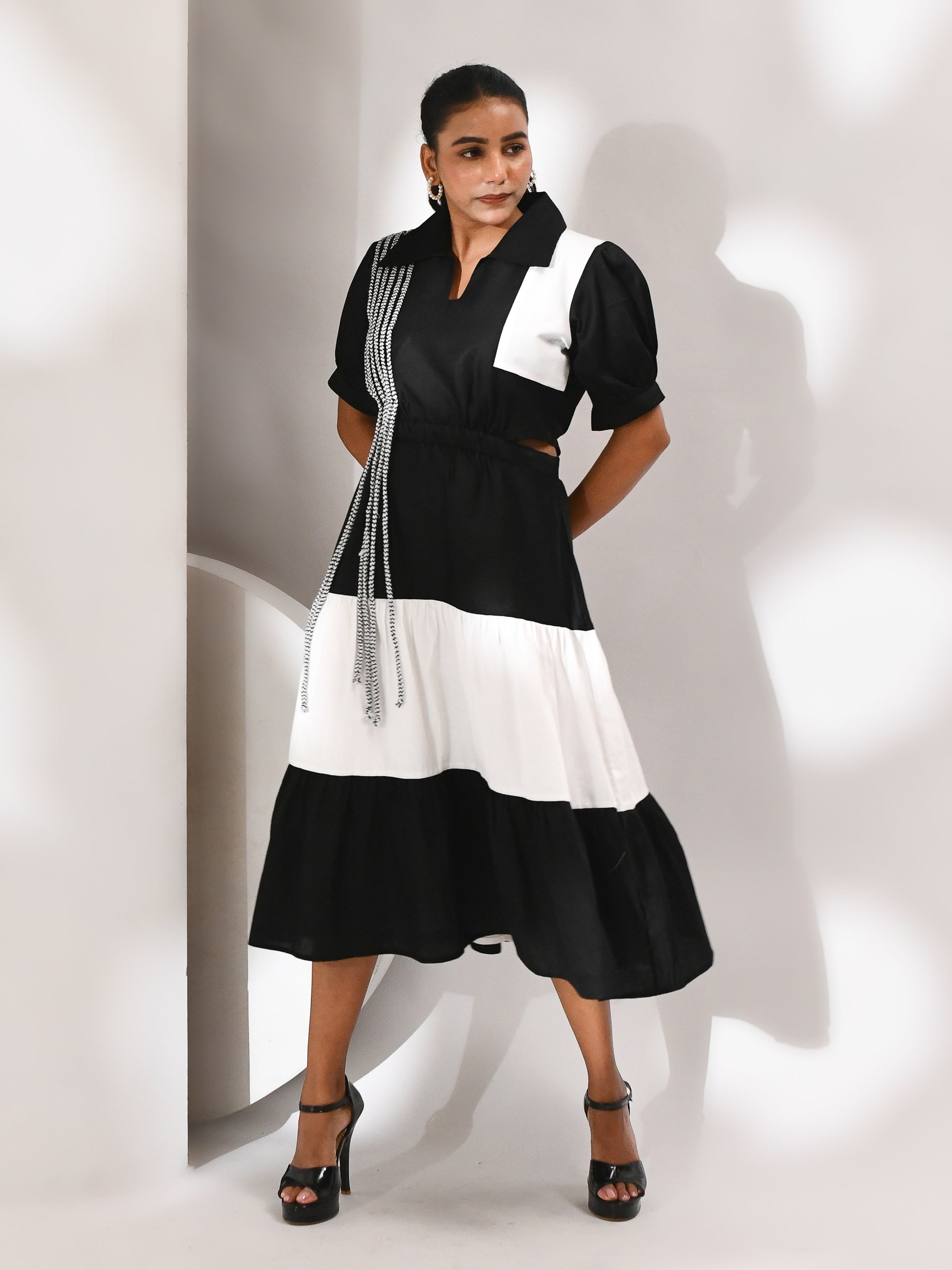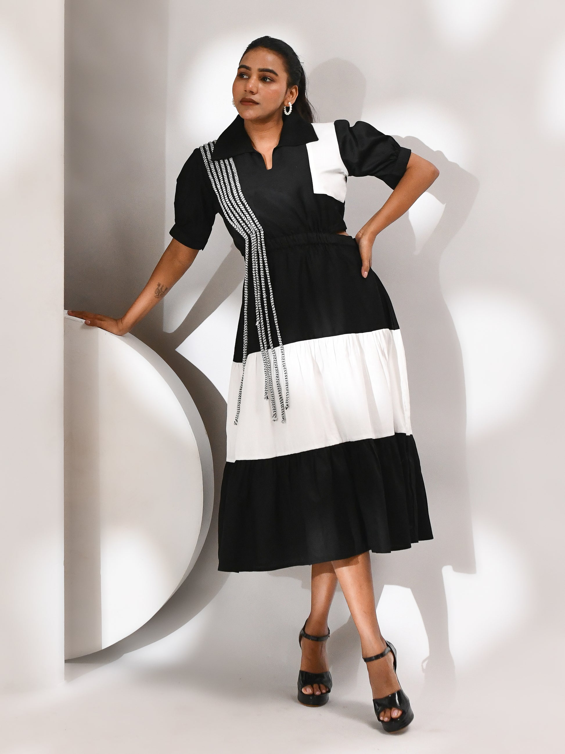 A striking monochrome dress designed with layered tiers that flow with movement and structure. Side cutouts bring in a bold edge, while the flared hem adds a sense of fluidity with every step. Finished with abstract dori detailing across the silhouette, creating texture and depth against its statement palette.