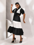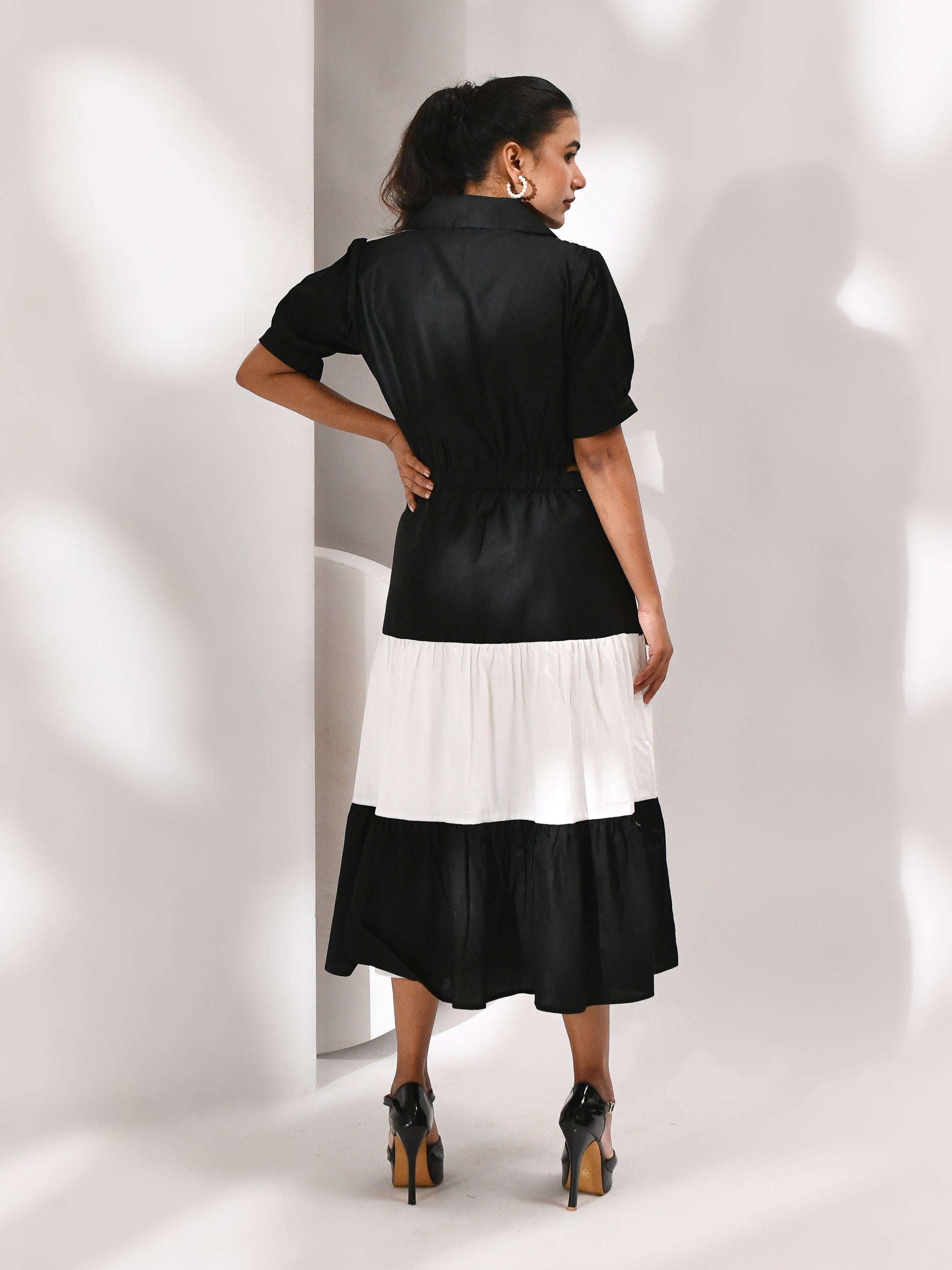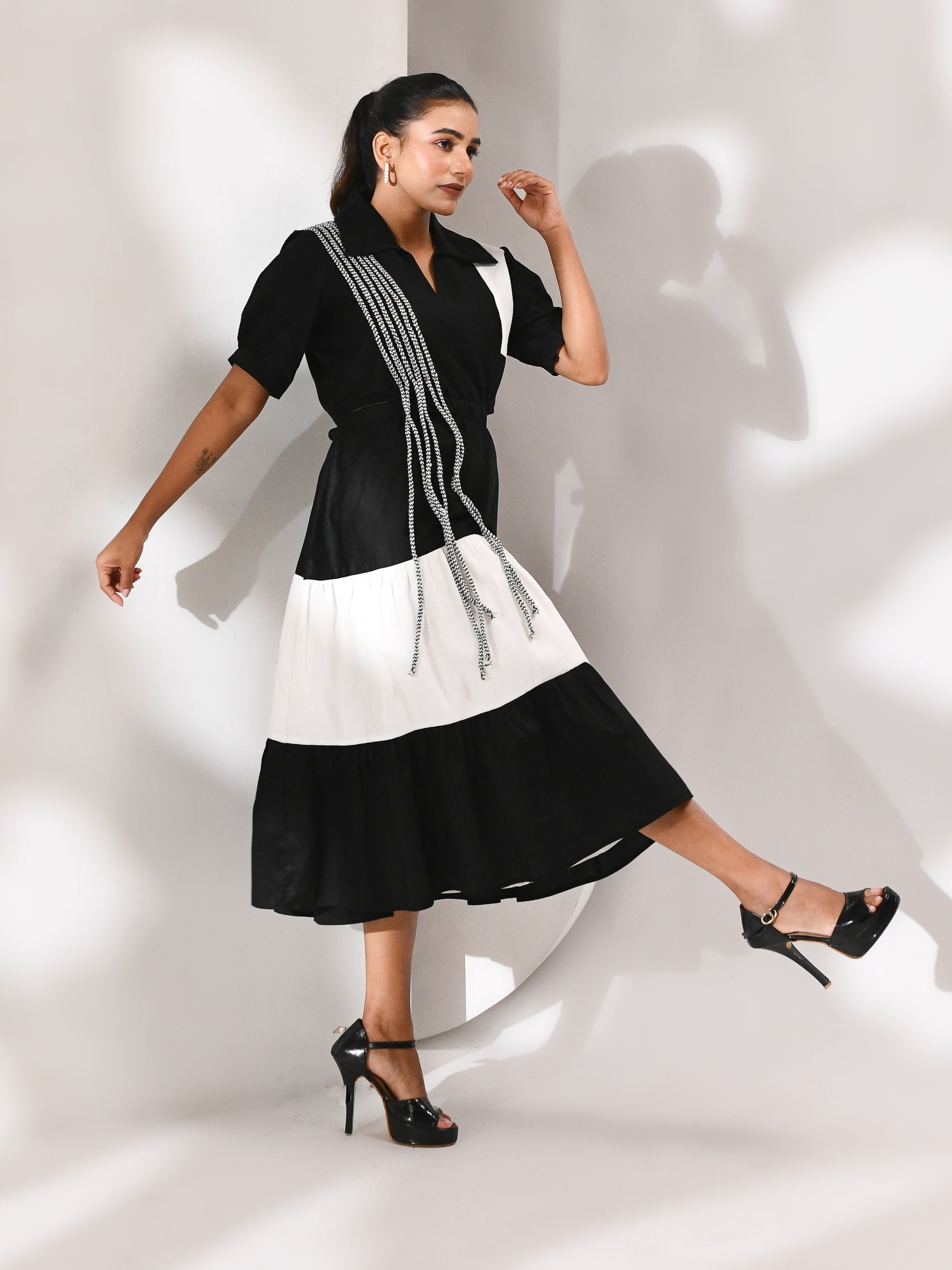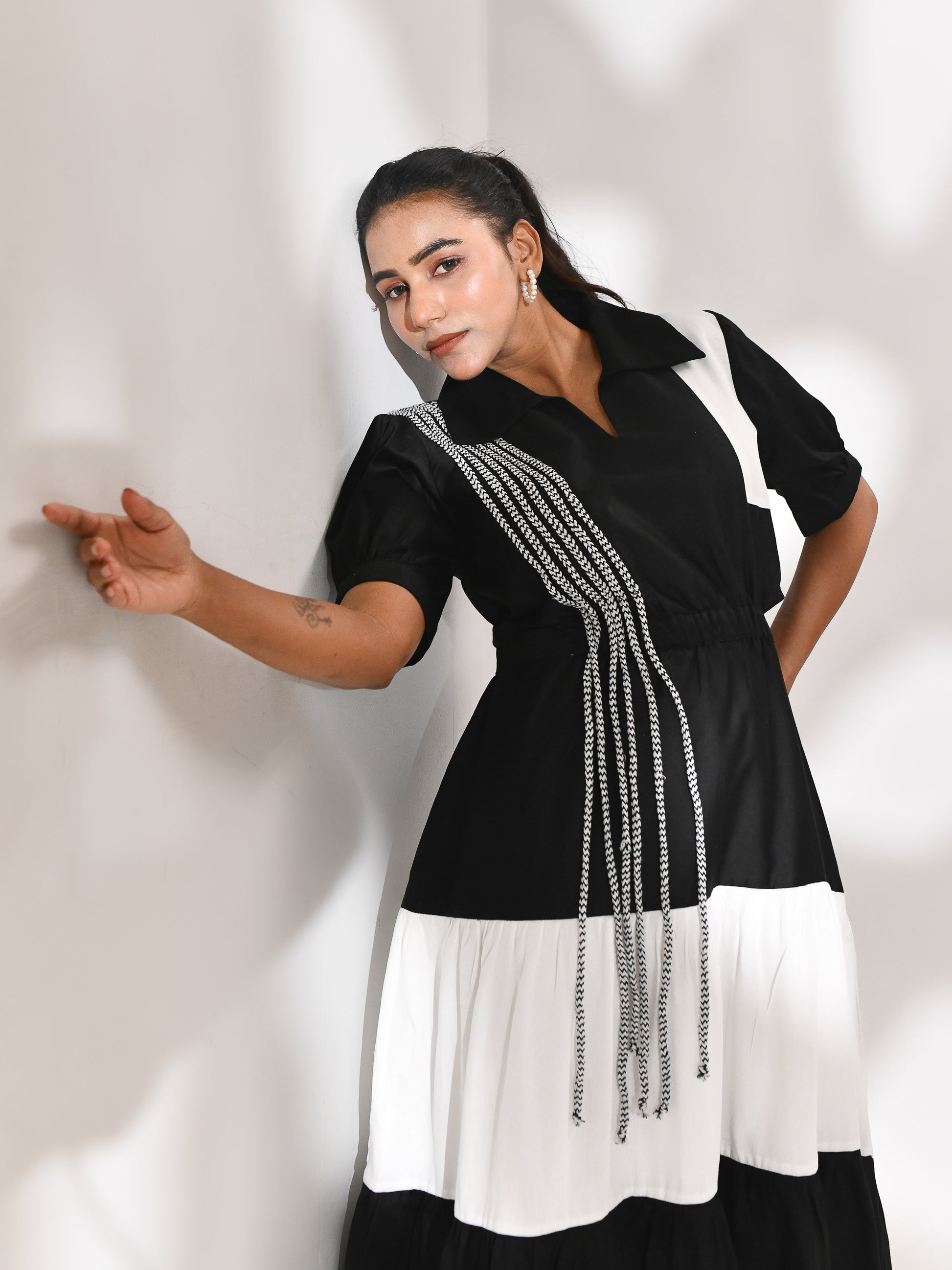 A striking monochrome dress designed with layered tiers that flow with movement and structure. Side cutouts bring in a bold edge, while the flared hem adds a sense of fluidity with every step. Finished with abstract dori detailing across the silhouette, creating texture and depth against its statement palette.
