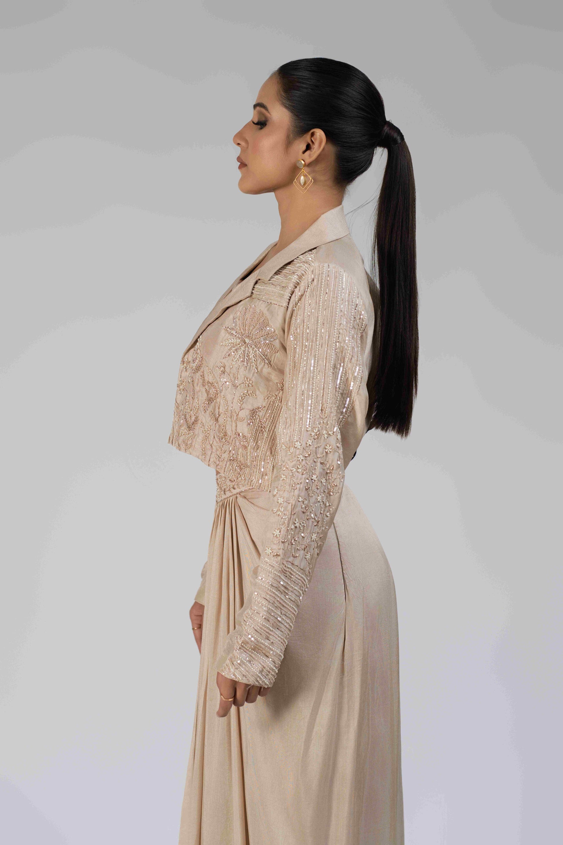 Ivory Embellished Indo-Western Set with Drape Skirt - Modern Festive Wear