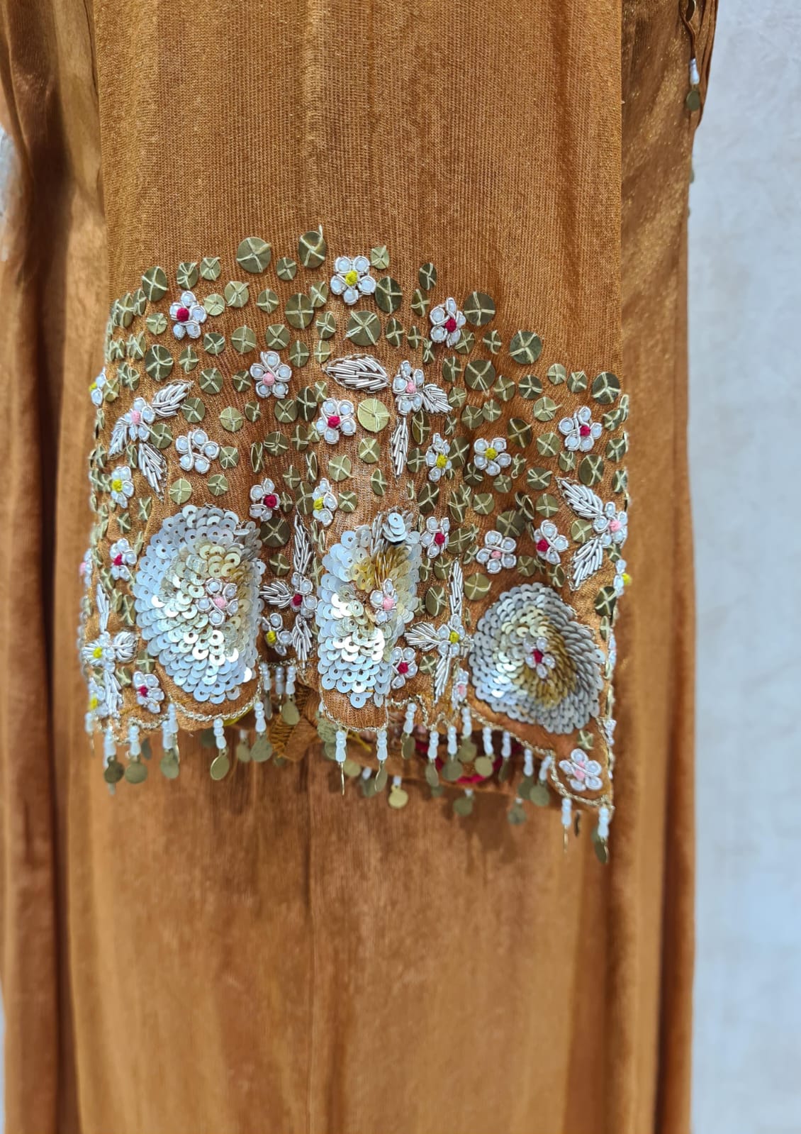 -Heavy floral embroidery with sequins and beadwork at sleeve ends.