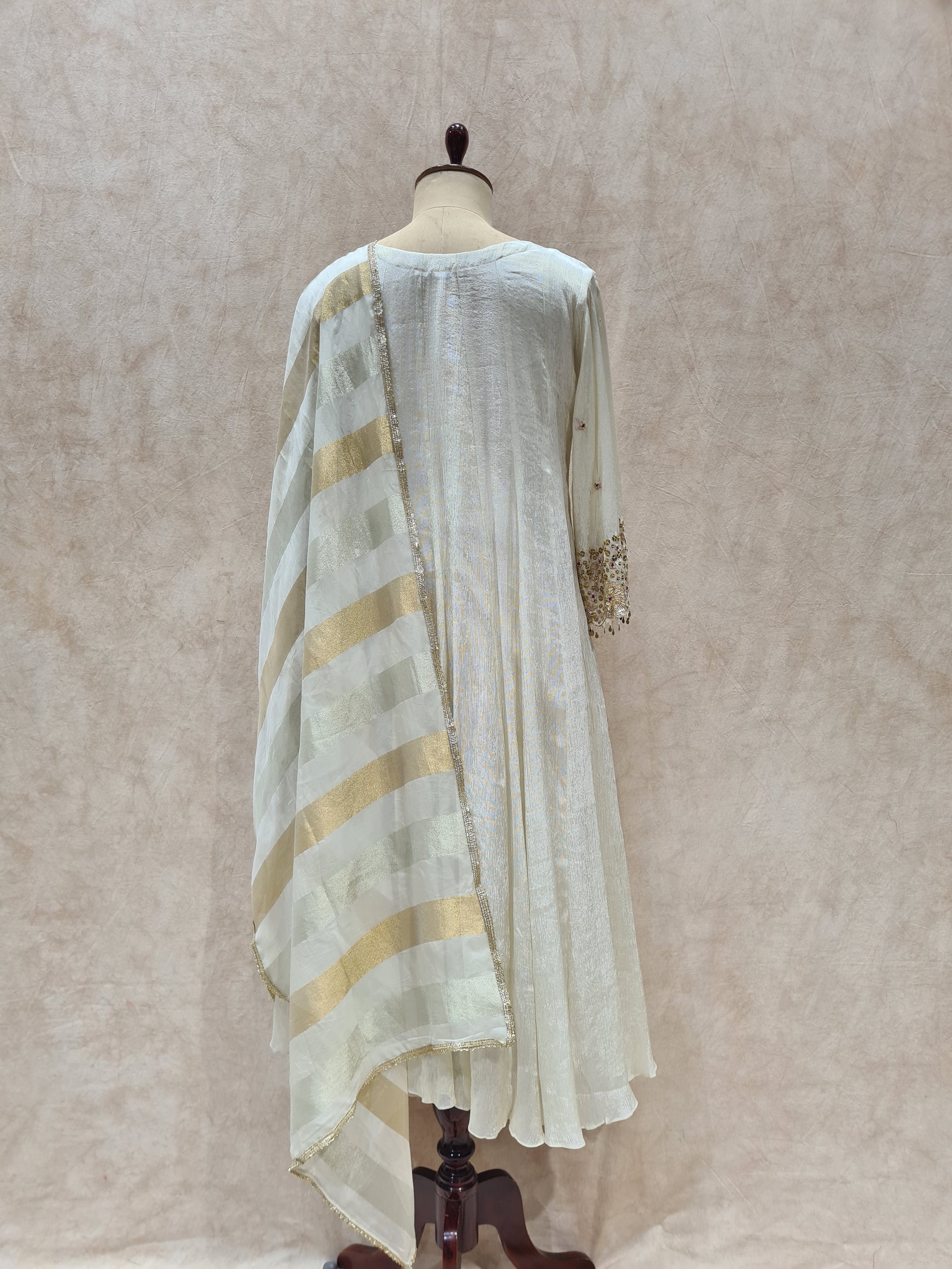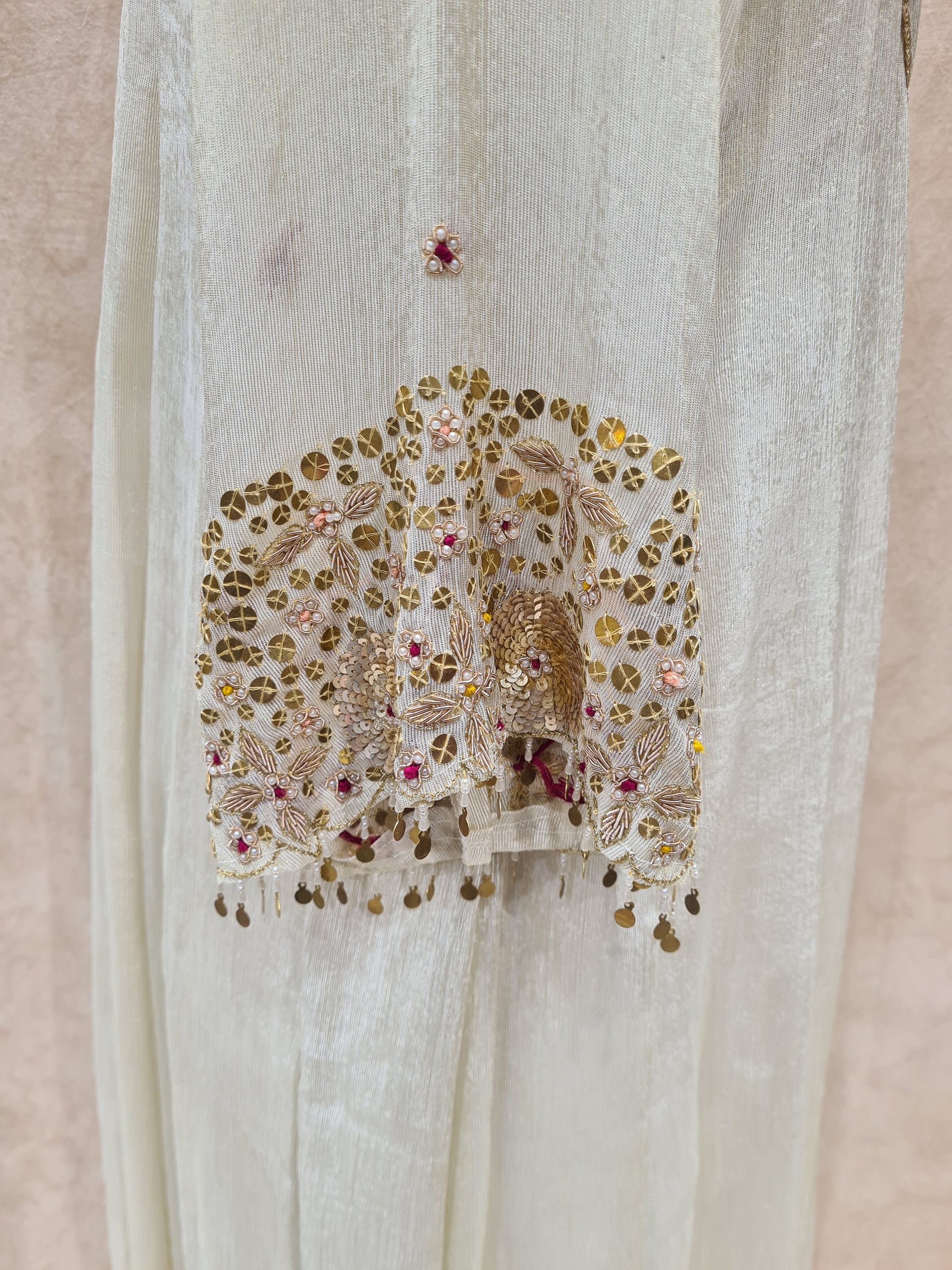 -Intricate sequin and thread embroidery on the yoke and sleeve ends.