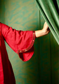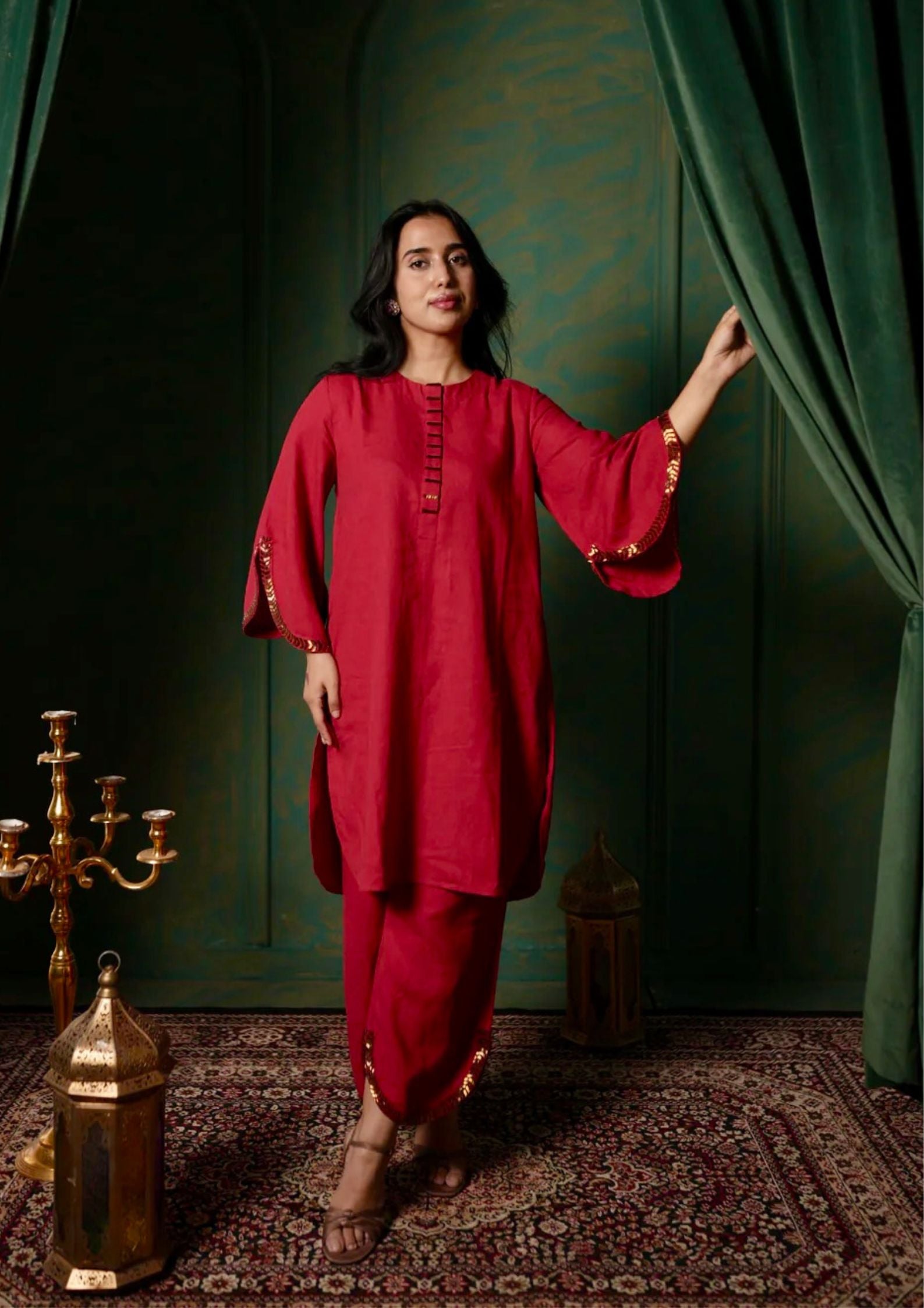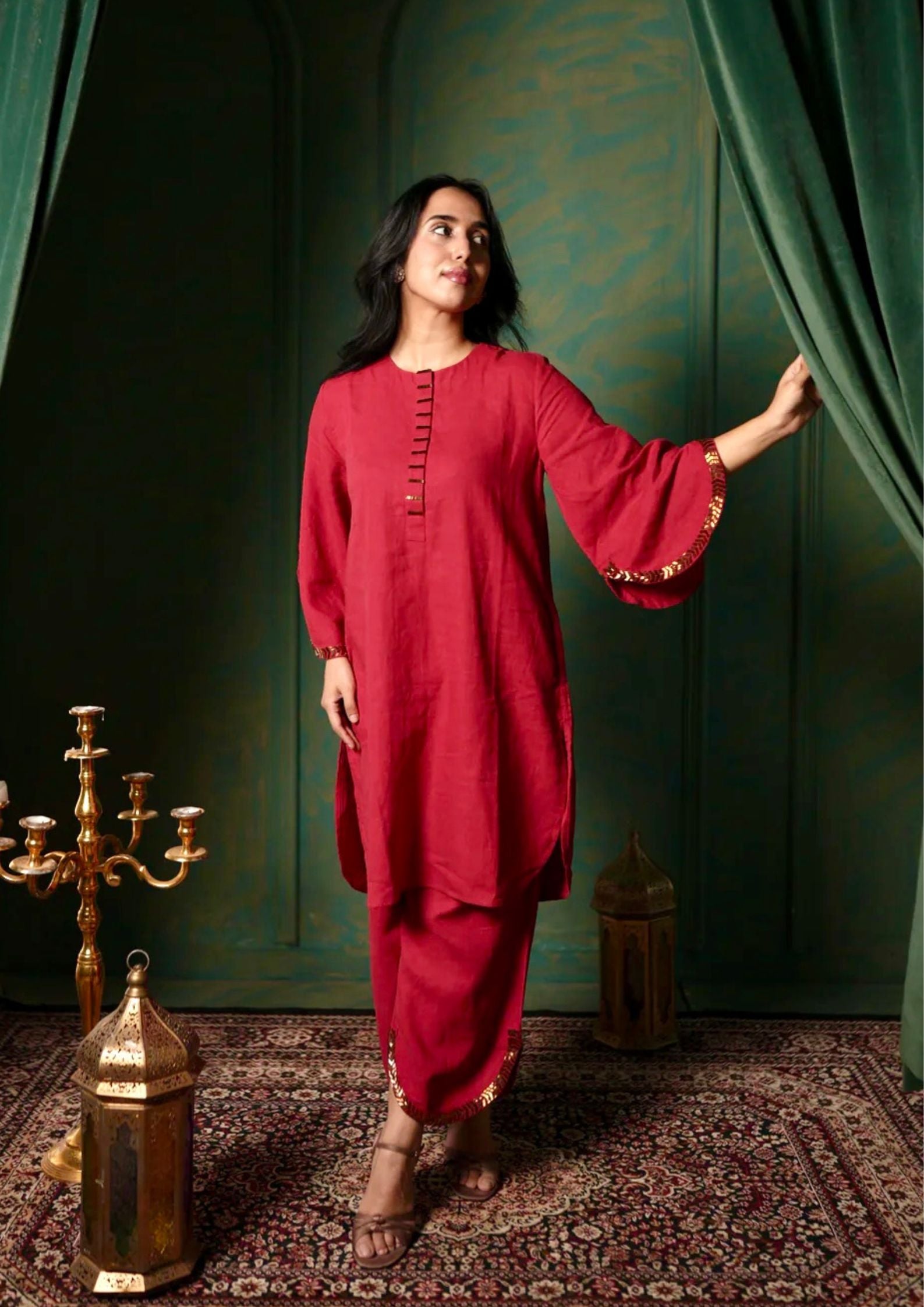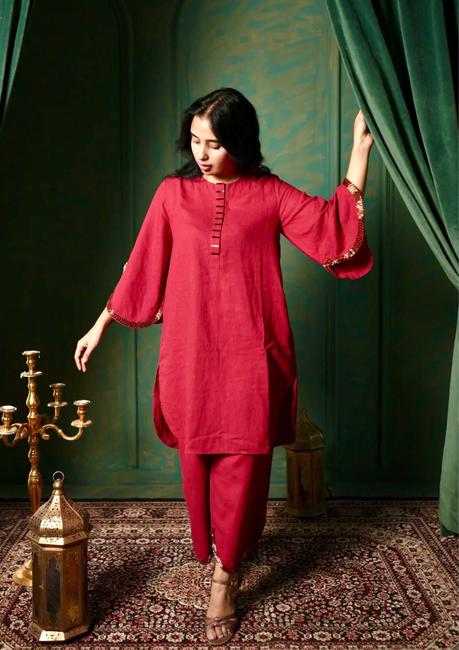 A striking red kurta pant set designed for festive celebrations, weddings, and special gatherings. The rich red tone creates a bold elegant statement, while the kurta paired with coordinated pants offers a polished and graceful look. Gold border detailing along the sleeves and pant hem adds a refined festive touch with subtle shine. Made from a breathable linen blend that feels light, comfortable, and ideal for long celebrations and warm weather occasions.