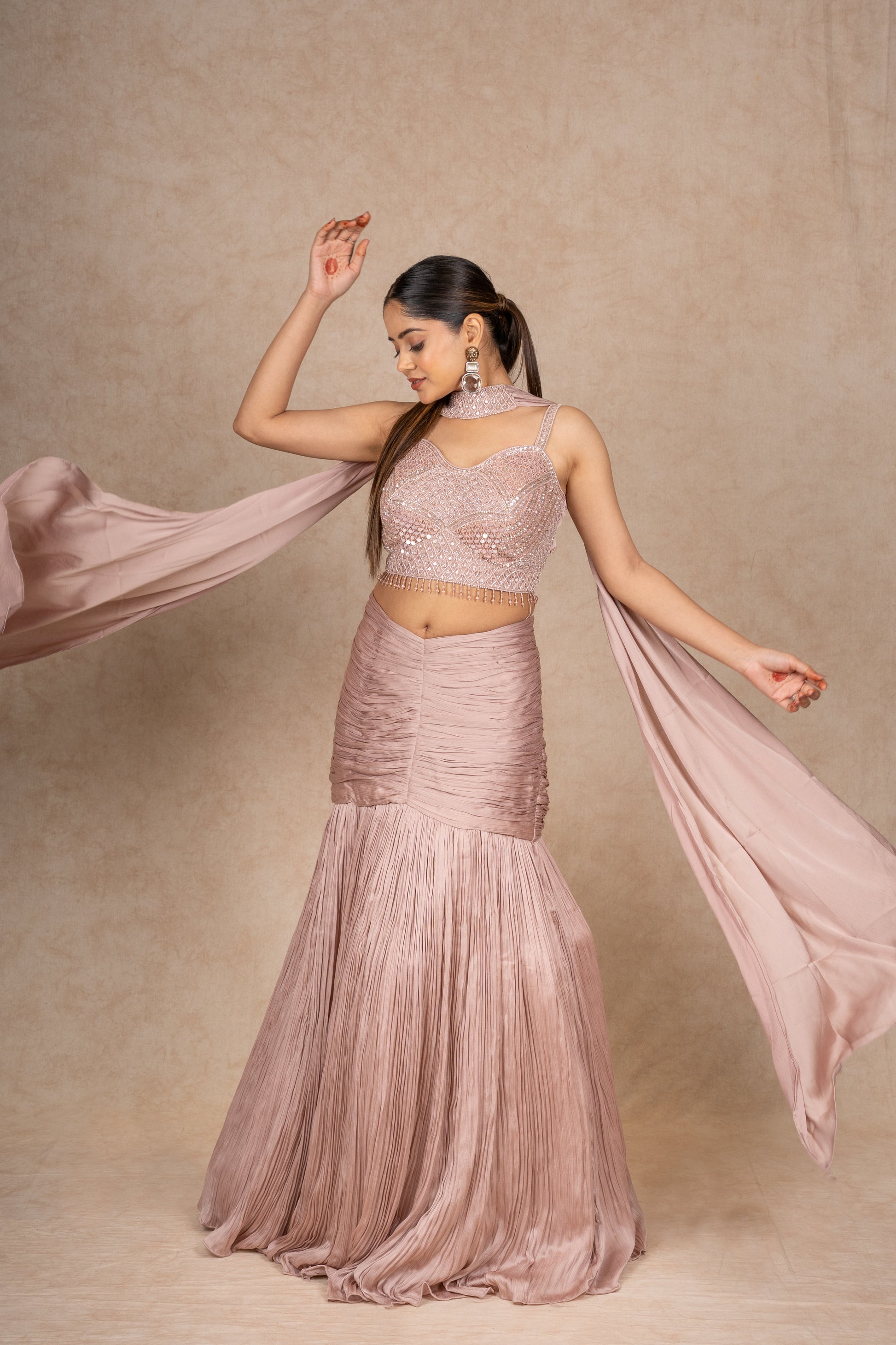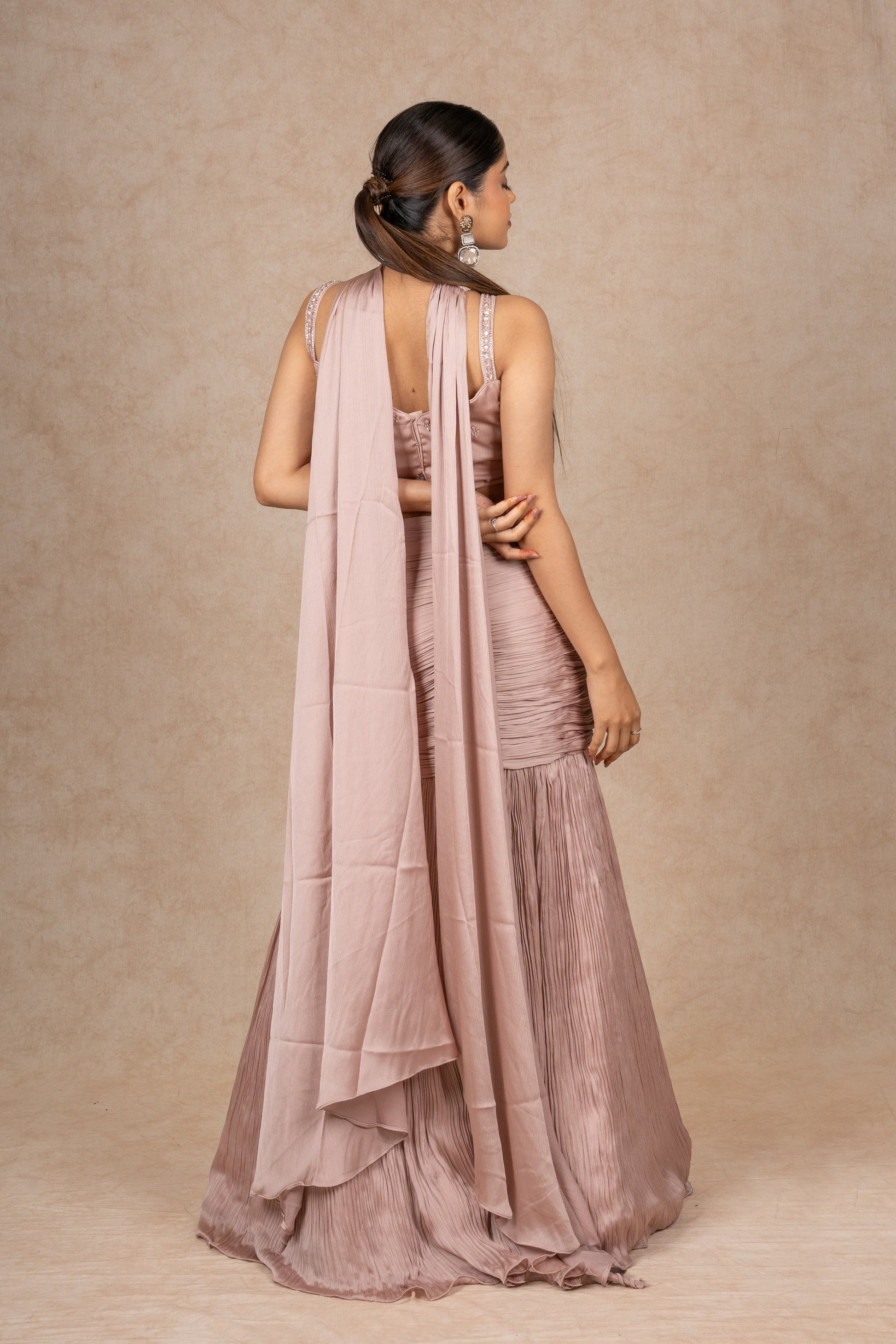 The satin is pleated and draped to create a flattering silhouette that flows beautifully with movement.
