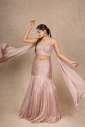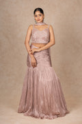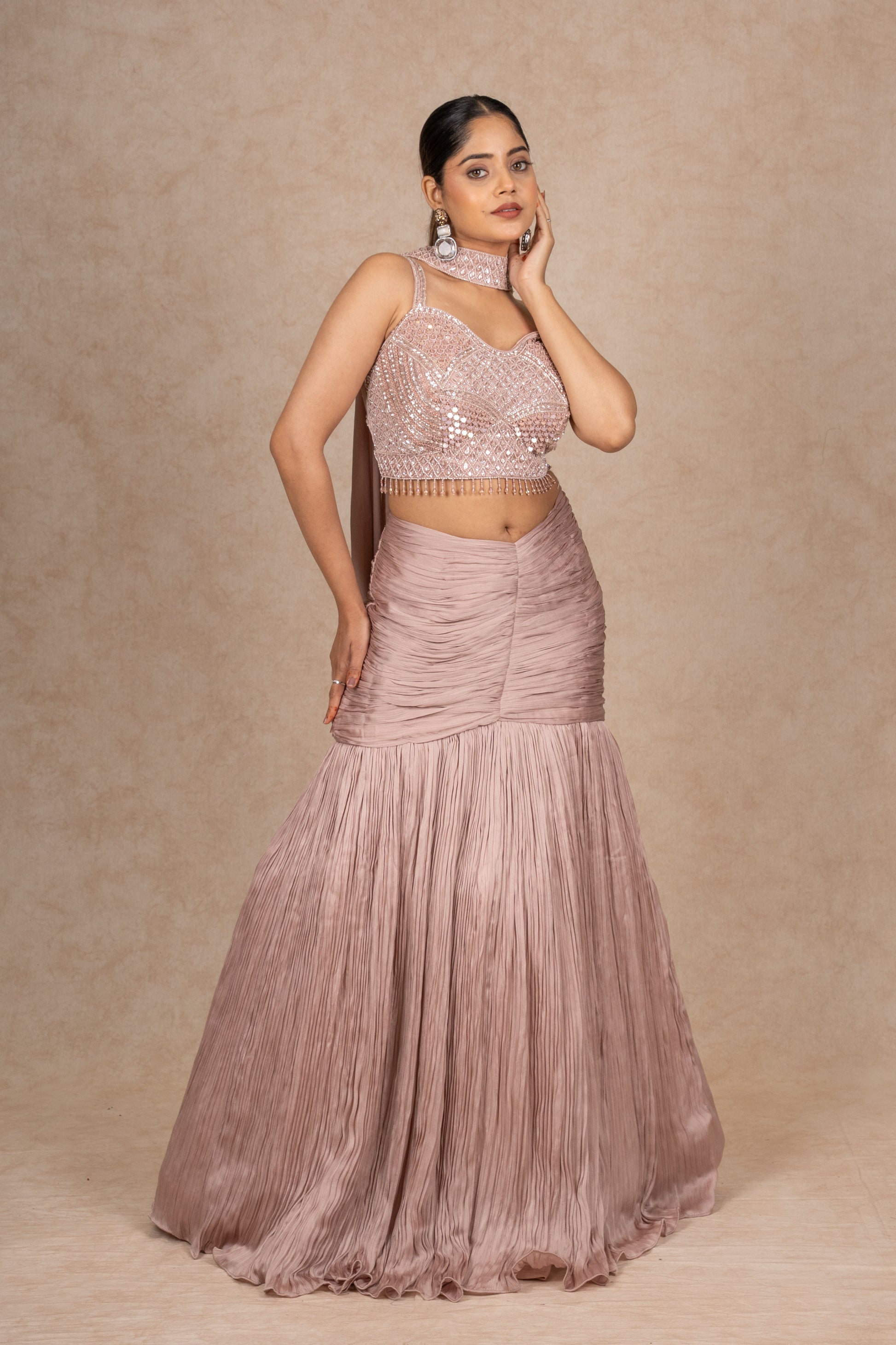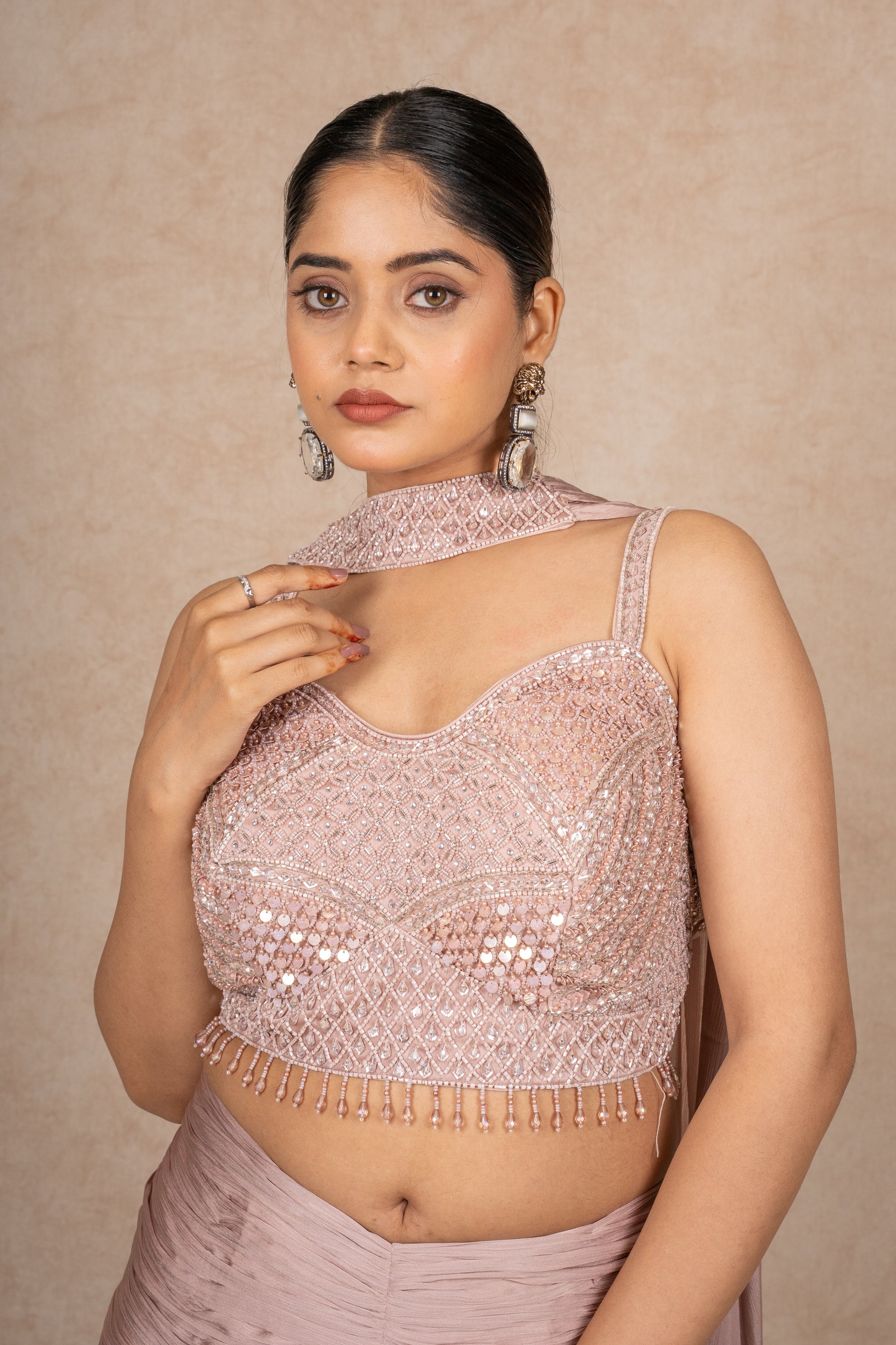 The fitted bustier is crafted from a sheer, delicate net fabric, heavily adorned with the aforementioned bead and sequin work. The skirt and the attached pallu (drape) are made from a rich, flowing satin fabric, known for its smooth texture and beautiful sheen.