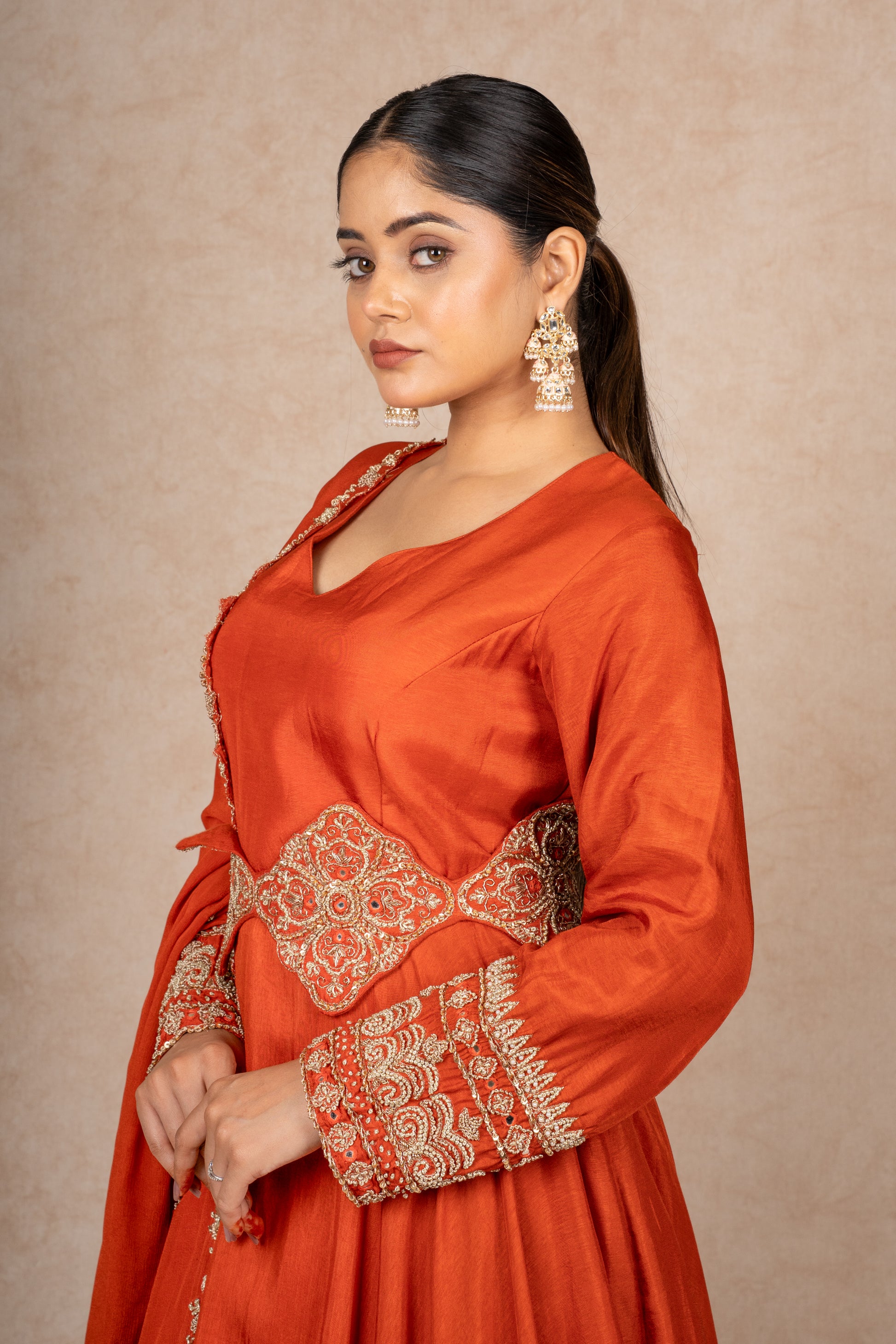 This exquisite gown is crafted from luxurious silk, known for its rich texture and subtle sheen. The vibrant rust orange color adds a touch of regal elegance.