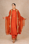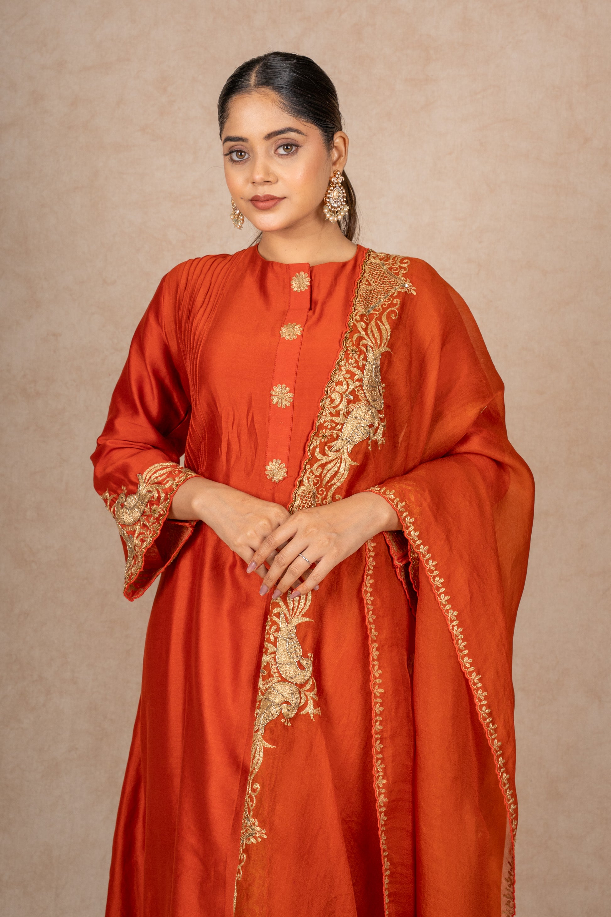 dupatta in the same burnt orange, also embellished with delicate gold zari work along its borders.