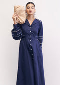 Feel cool and look sharp in our Seya Dress. This outfit comes in a deep navy blue color that looks very neat and professional. It features a classic collar and white buttons all the way down the front, making it easy to wear. The dress has a nice fit around the waist and flares out at the bottom, giving it a fun and girly shape that is perfect for any daytime activity. The best part of this dress is the unique puffy sleeves. We’ve added thin white lines across the arms to match the buttons, making the whole outfit look coordinated and sporty. It’s a simple design that still looks very high-fashion and special.