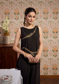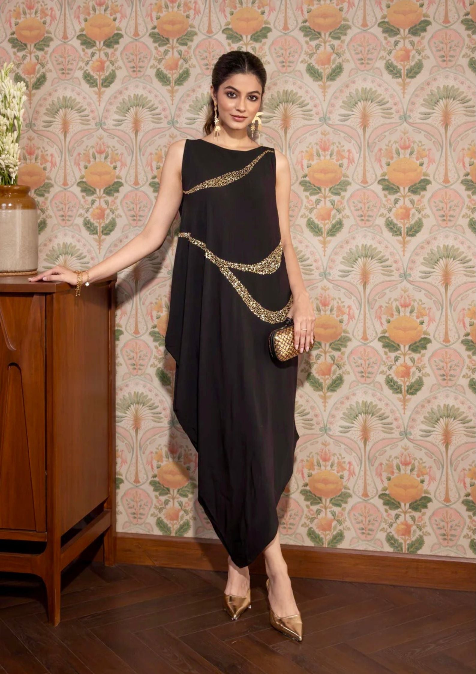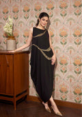A striking black Moroccan crepe dress designed for elegant evening occasions. Featuring a sleeveless neckline and a fluid, flattering silhouette, the dress is highlighted by wave-inspired diagonal embellishments with delicate bead and sequin detailing that add a subtle shimmer.