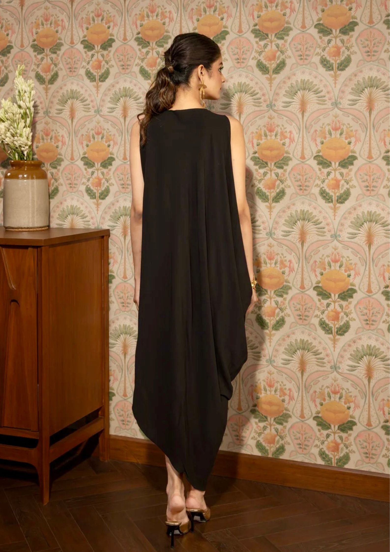 Crafted from premium Moroccan crepe, the fabric offers a lightweight feel and graceful drape, ensuring both comfort and sophistication. Perfect for cocktail evenings, festive gatherings, and modern celebrations.