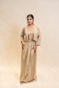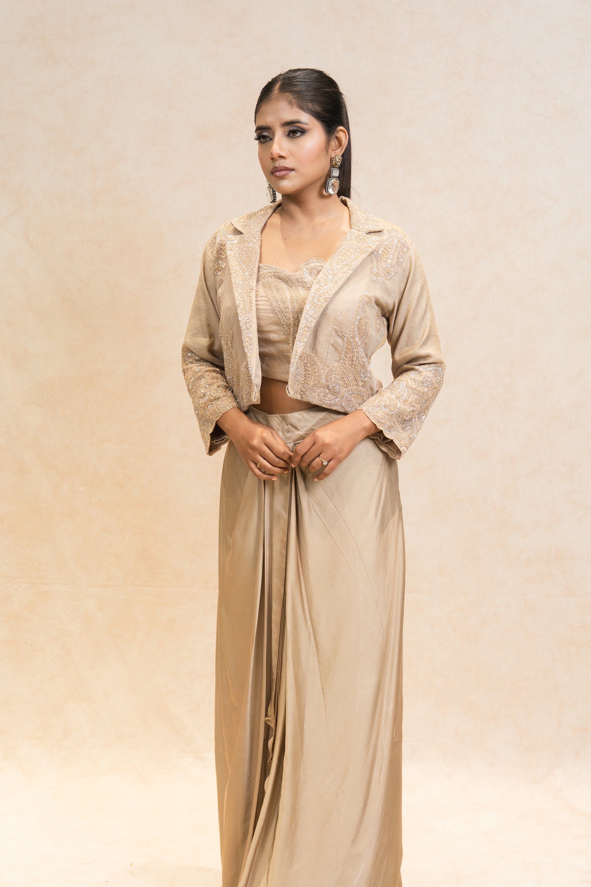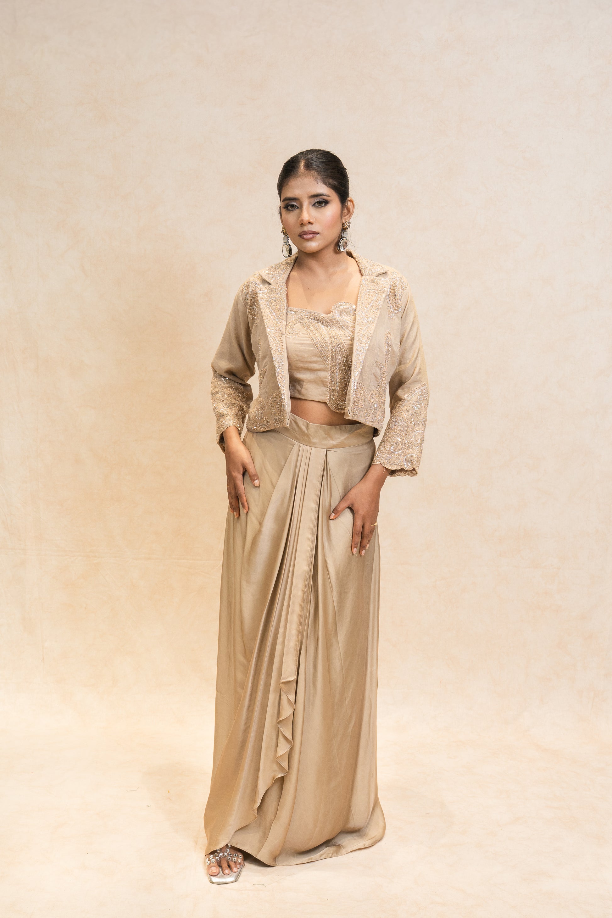 This elegant three-piece ensemble is a modern fusion of traditional and contemporary design. Crafted in a luxurious champagne-gold hue, it features a chic embroidered jacket, a structured bustier and a draped skirt that flows with sophistication. Perfect for festive occasions, cocktail parties, or weddings, this outfit brings together glamour and grace in equal measure.