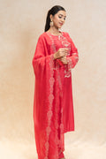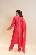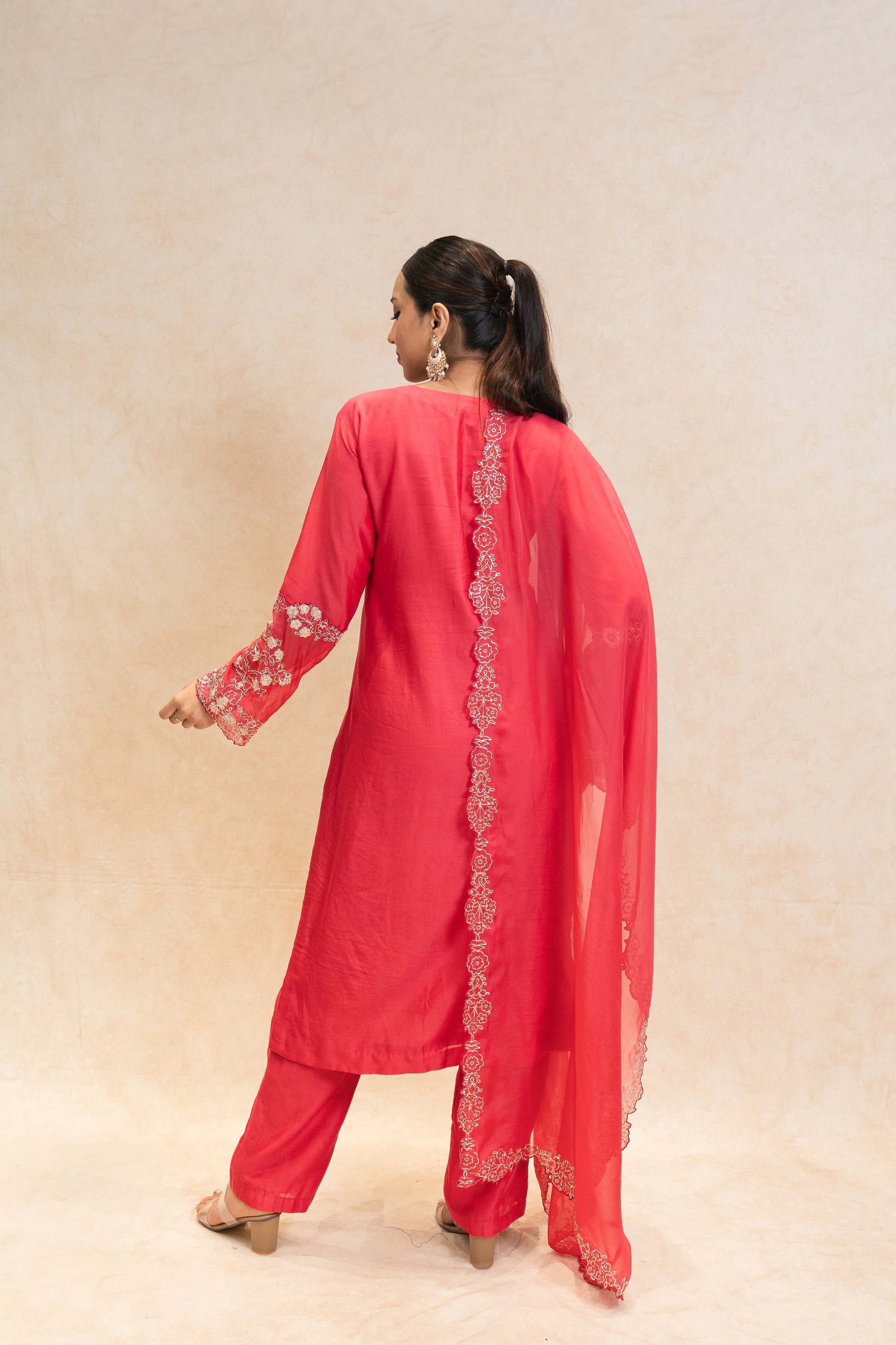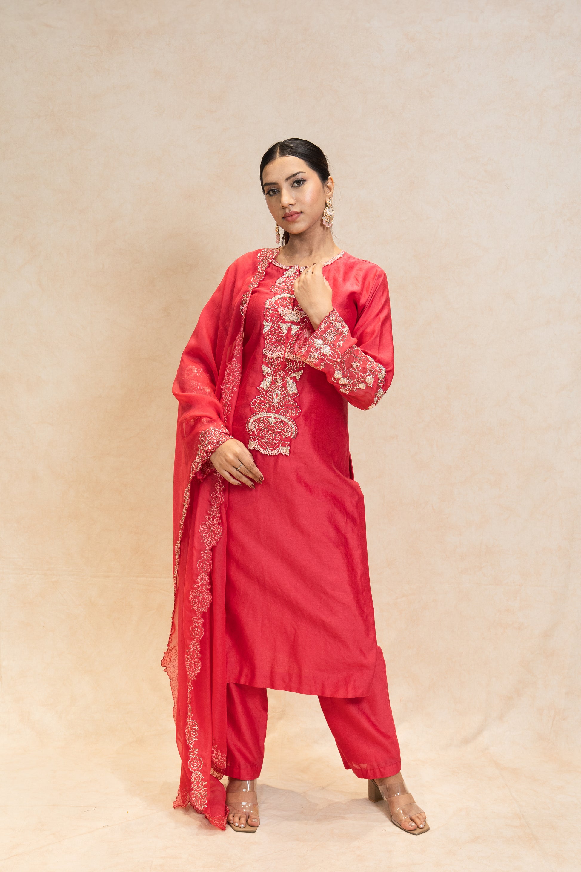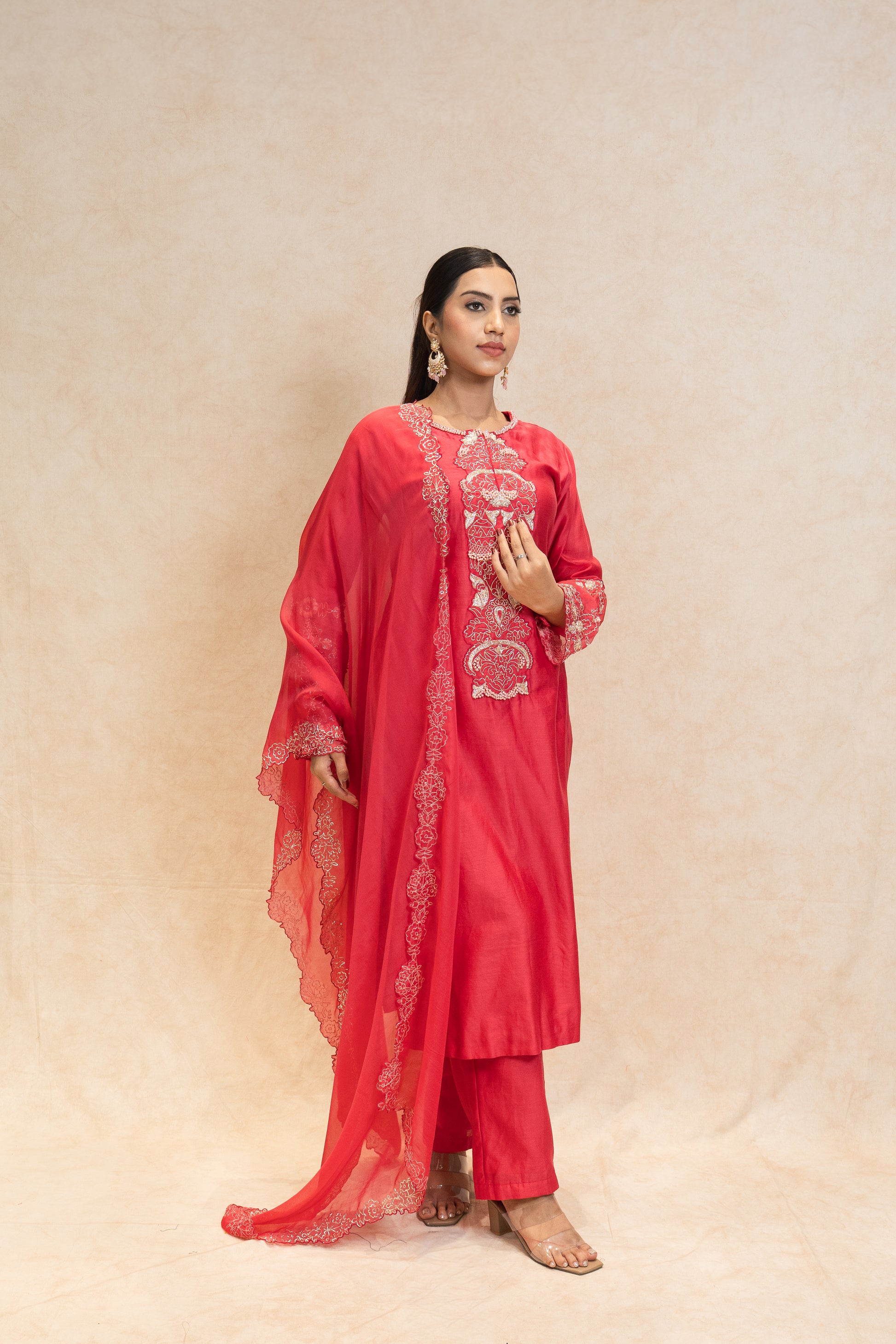 Radiate festive elegance in this three-piece embroidered set featuring a striking red kurta, coordinated pants and a sheer dupatta. Designed with delicate zari embroidery and beadwork timeless details, this ensemble is perfect for weddings, festive occasions, or elegant evening gatherings.